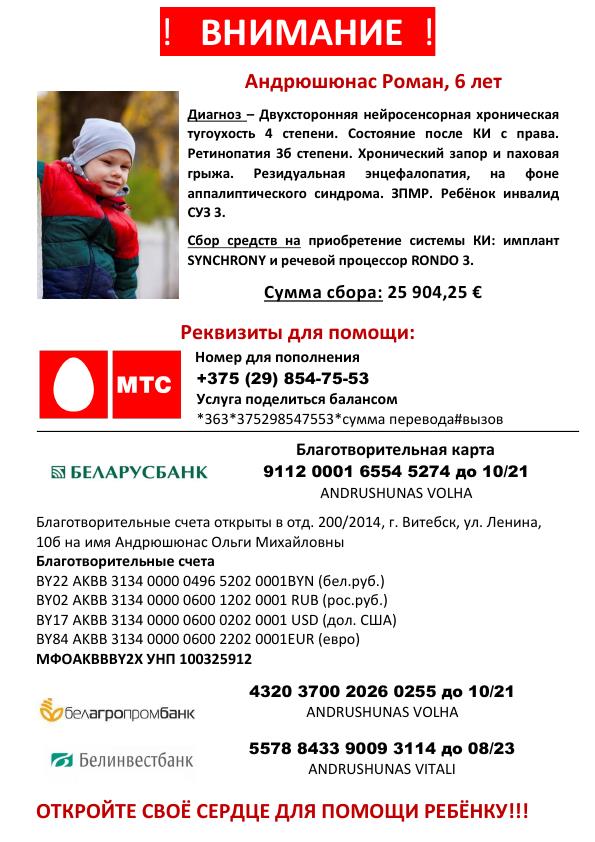 В Беларуси операцию делают бесплатно на одно ушко, на второе у нас нет средств. В нашей семье пока работает один папа, я занимаюсь реабилитацией ребёнка. Батарейки, различные комплектующие для речевого процессора, реабилитация сына — все это тоже требует материального вложения, с которым мы самостоятельно справляемся. А вот сумма имплантации второго уха, на сегодняшний момент, составляет 25904,25 евро, таких огромных денег в нашей семье нет.