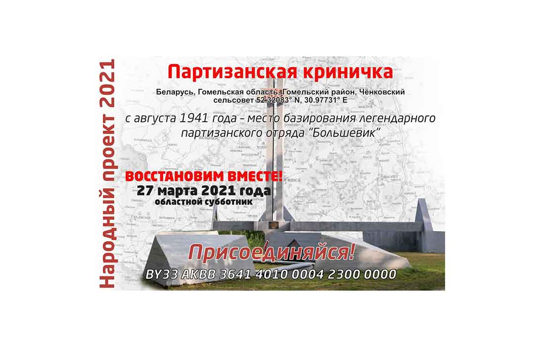 27 марта на Гомельщине пройдёт областной субботник. Средства перечислят на реконструкцию «Партизанской кринички», где в годы Великой Отечественной войны дислоцировался легендарный партизанский отряд «Большевик».