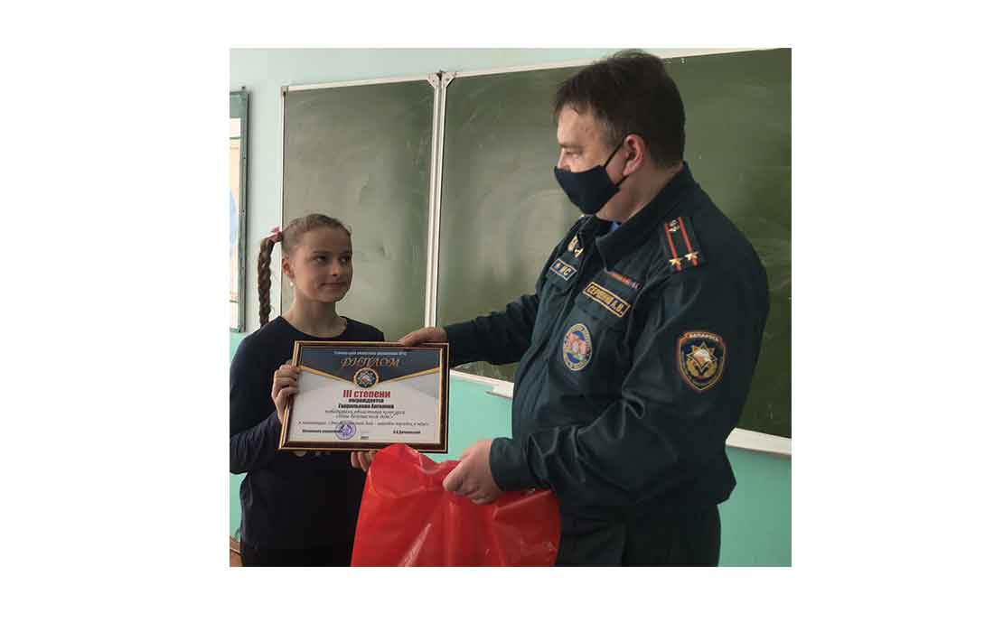 В государственном учреждении образования «Лоевская средняя школа имени А.В.Козлова» первый заместитель начальника Лоевского РОЧС Андрей Сергеенко поздравил, вручил подарки и диплом третьей степени учащейся