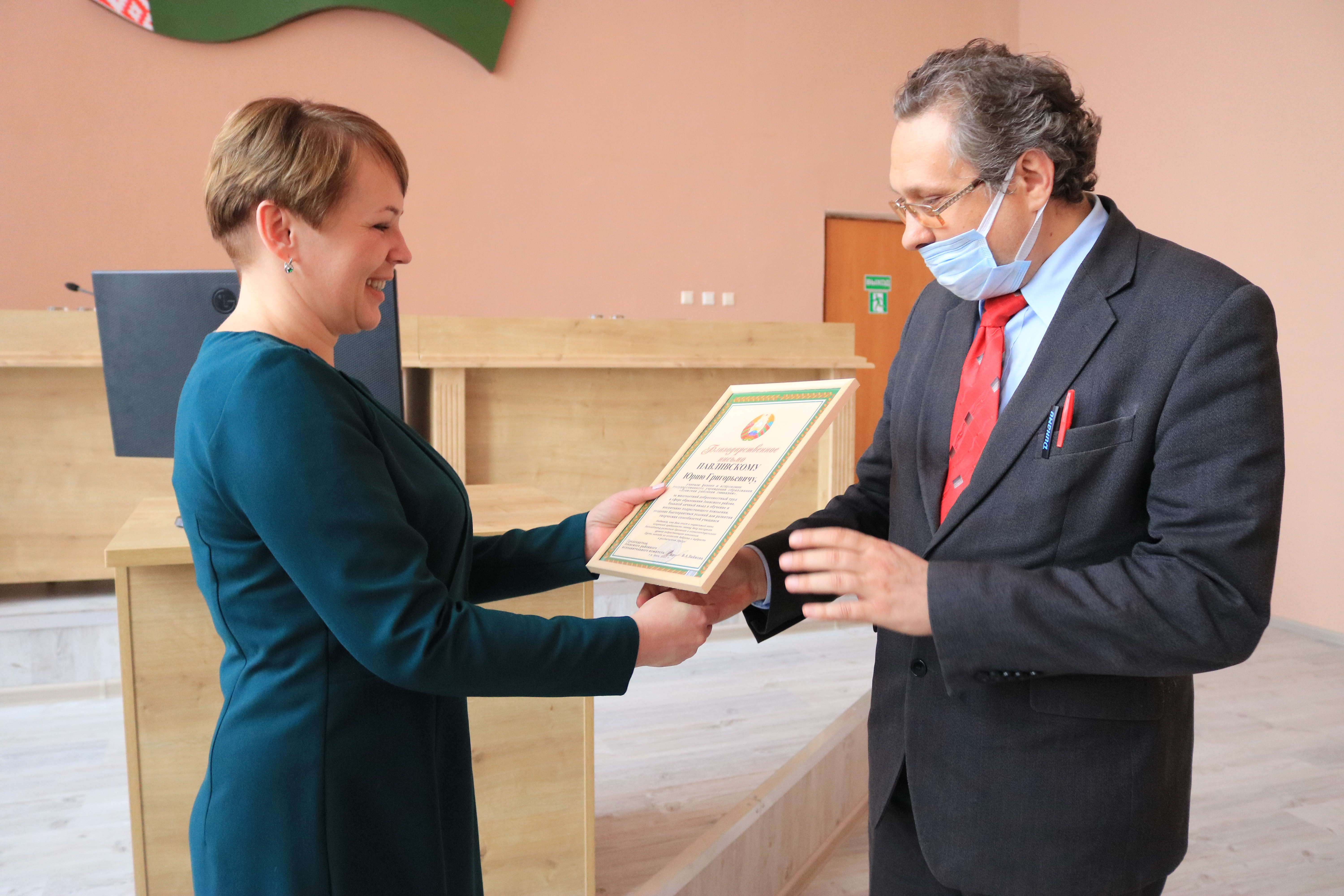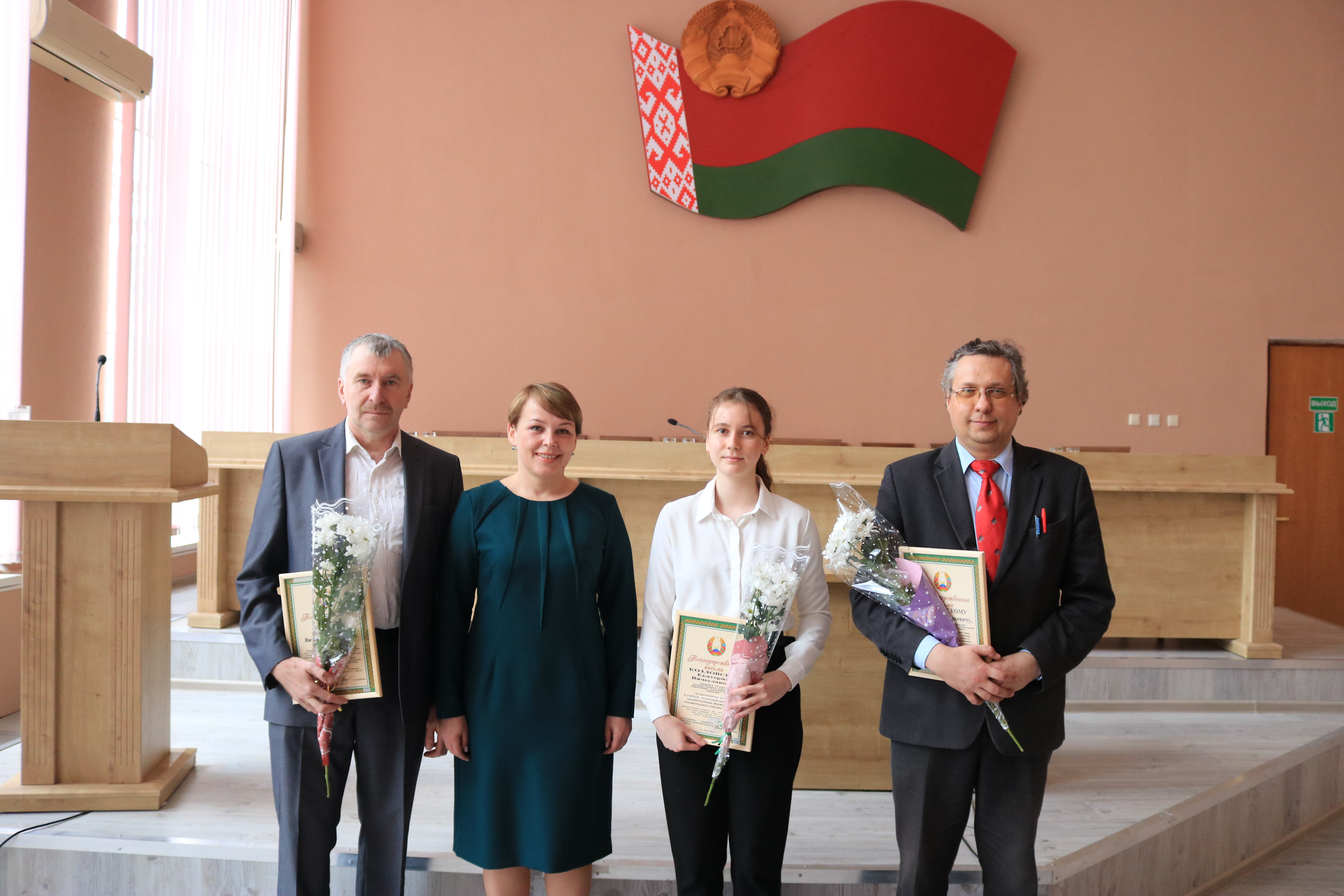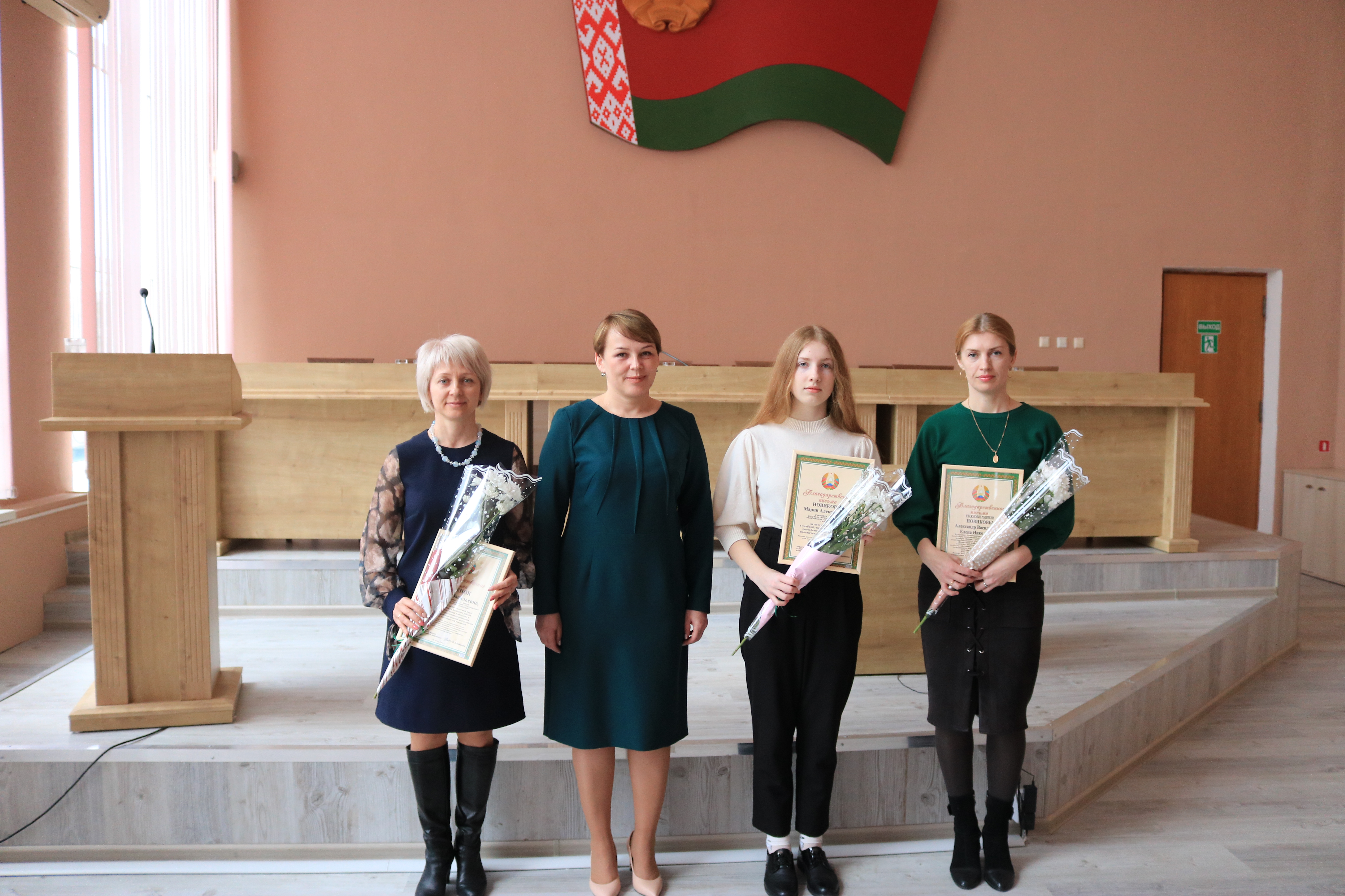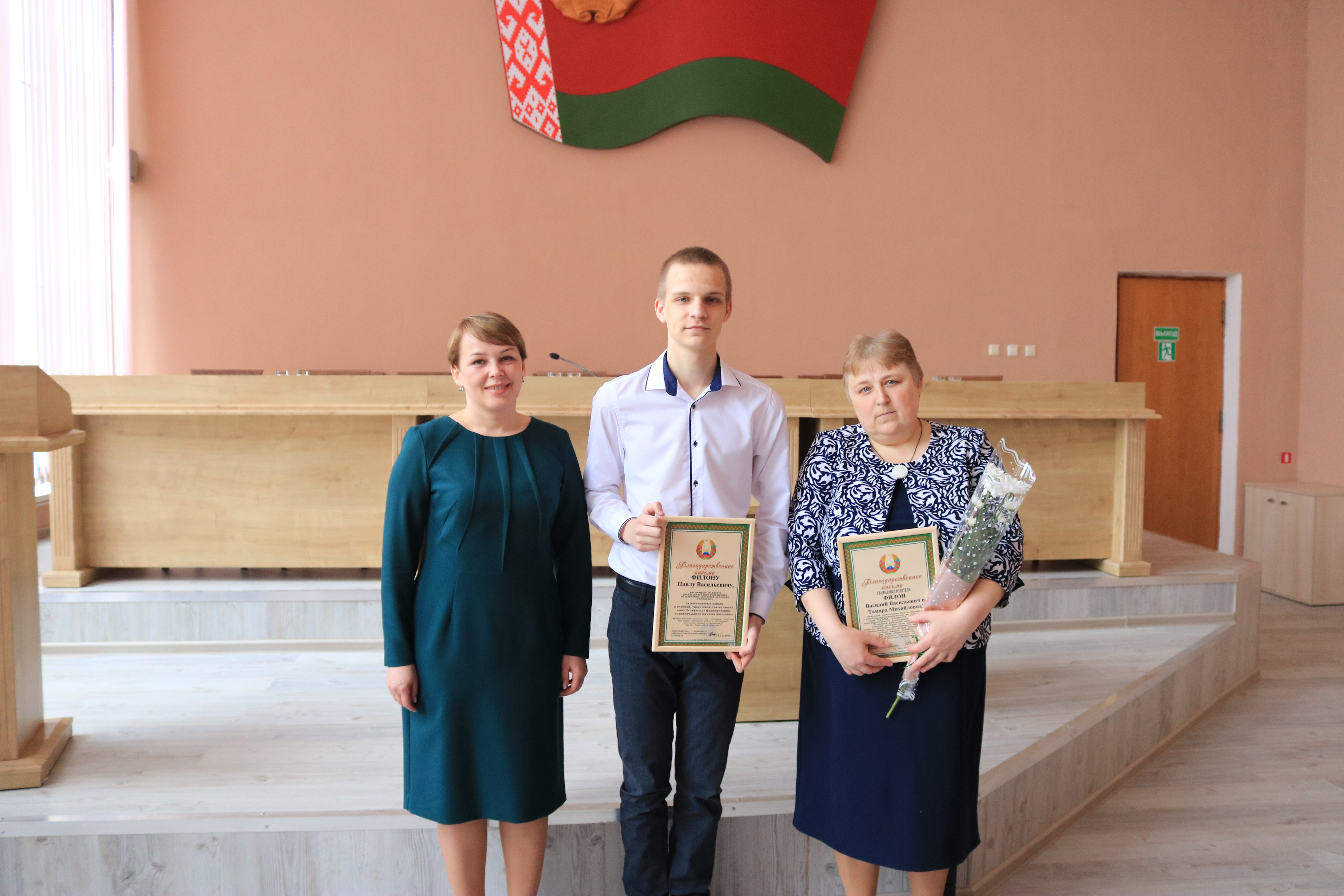 Вероника Анатольевна под громкие аплодисменты вручила Благодарственные письма Лоевского райисполкома десятиклассникам районной гимназии — Павлу Филону, Марии Новиковой, Екатерине Козловской, их родителям — Тамаре Филон, Елене Новиковой, Вячеславу Козловскому и педагогам — Татьяне Романчук, Любови Басенок, Юрию Павливскому.