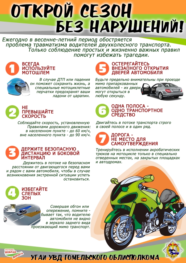 30 апреля 2021 года в Республике Беларусь проводится Единый день безопасности дорожного движения под названием «Открой сезон без нарушений!», направленный на профилактику ДТП с участием двухколесного транспорта.