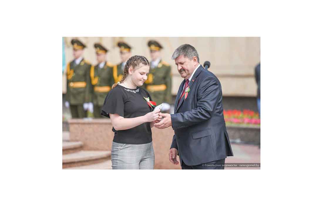 9 мая губернатор Гомельской области Геннадий Соловей вручил билеты и значки БРСМ ребятам из разных уголков региона во время празднования Дня Победы на площади Государственного