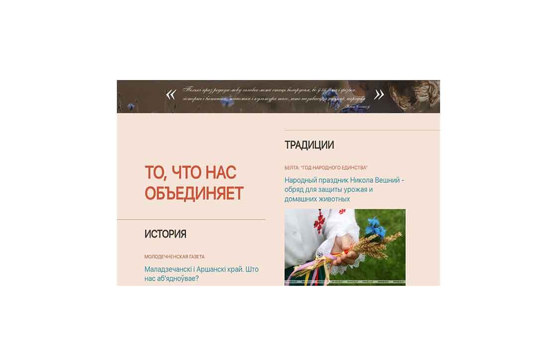 В рубриках «Традиции» и «Творчество» собраны материалы, посвященные народным обрядам и обычаям, умениям мастеров, которые передавались из поколения в поколение, а также рассказывается о современных талантах белорусов.
