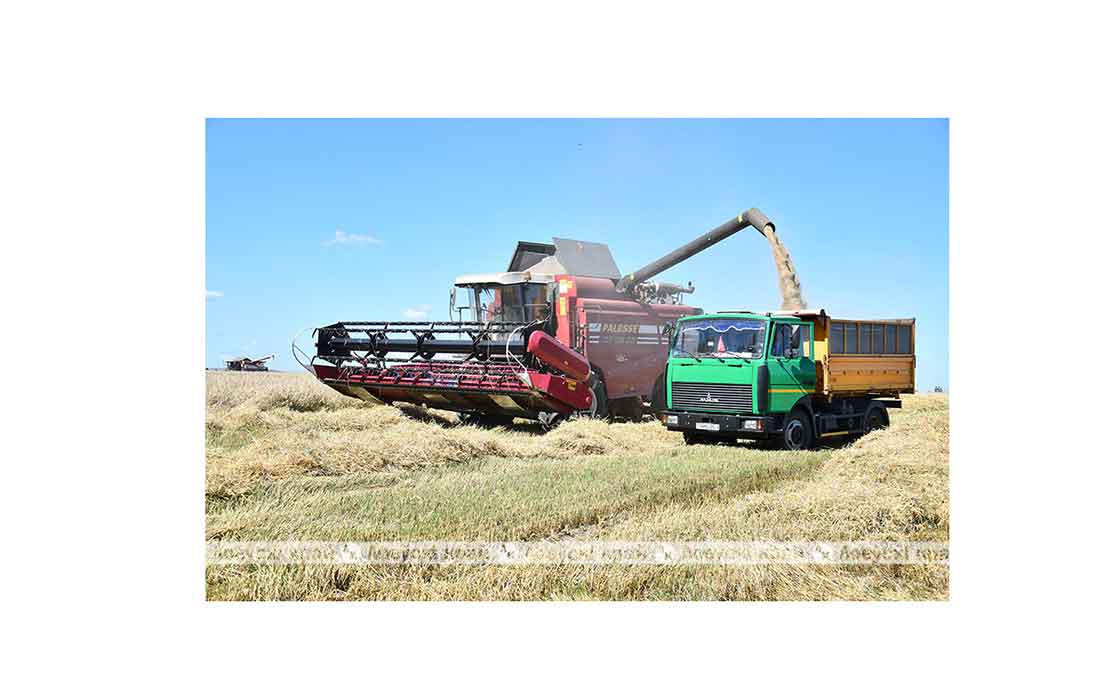 НА ЖАТВЕ: СРЕДИ КОМБАЙНЕРОВ: ГАВРИК Александр Николаевич, комбайнер, ФЕДОТОВ Владимир Дмитриевич, помощник комбайнера КСУП «Бывальки», которые комбайном КЗС-1218-10 убрали зерновые на площади 255 га
