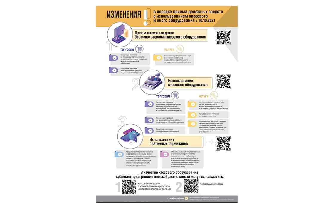 Также согласно внесенным изменениям субъекты хозяйствования с 10.10.2021 вправе не использовать кассовое оборудование при приеме наличных денежных средств в случаях: