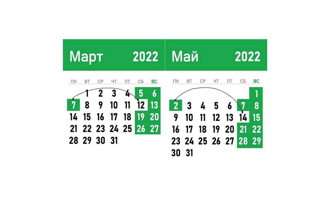 В 2022 году понедельник 7 марта будет перенесен на субботу 12 марта, а понедельник 2 мая — на субботу 14 мая.