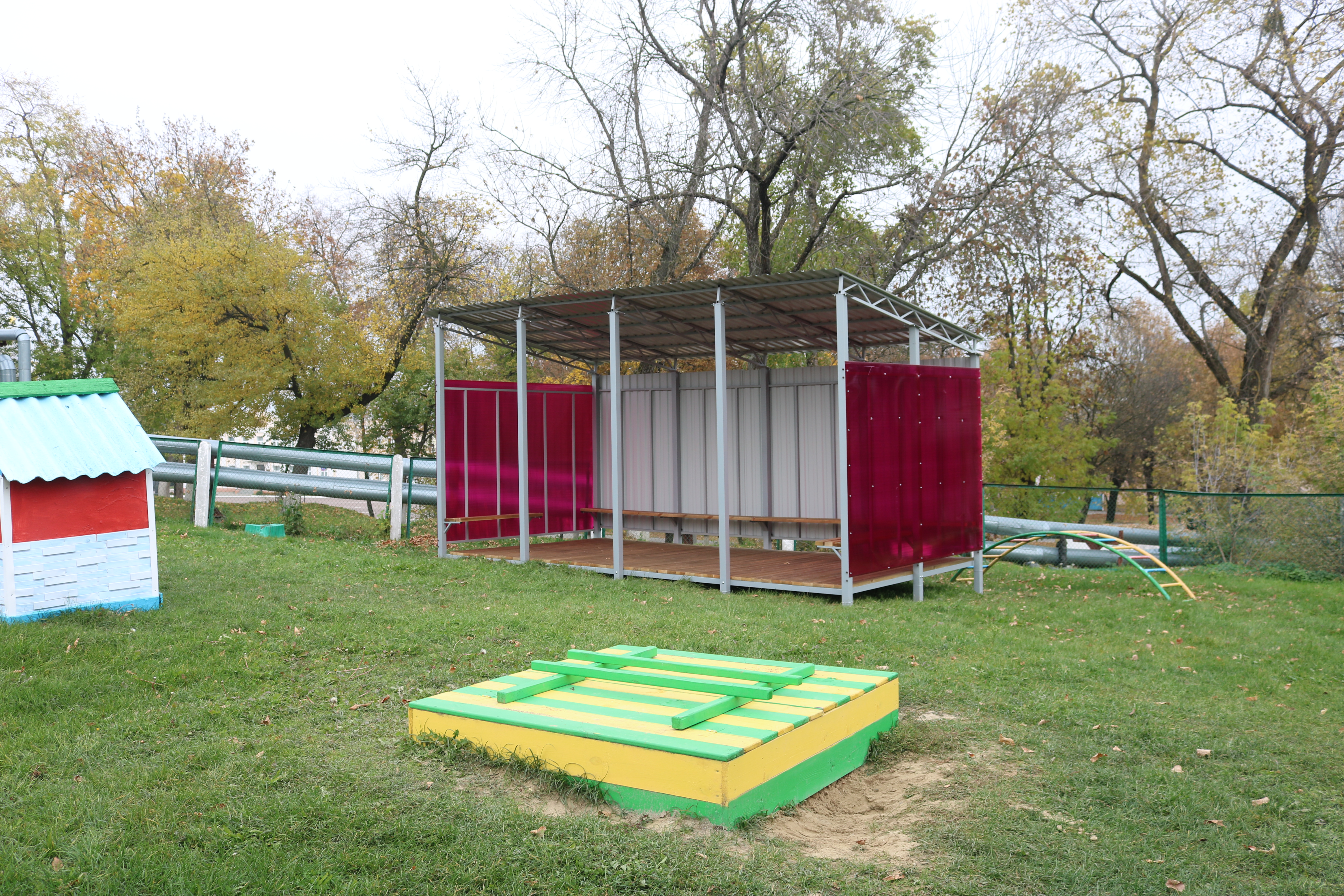Здесь появилась новая песочница, а также оборудован навес, который позволит ребятишкам спрятаться от палящих лучей солнца и дождей.