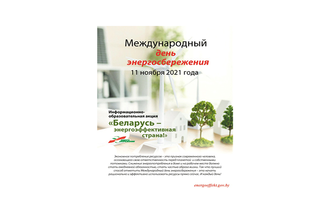 В целях реализации положений Директивы Президента Республики Беларусь от 14.06.2007 №3 «О приоритетных направлениях укрепления экономической безопасности государства», Закона Республики Беларусь от 08.01.2015 №239-З «Об энергосбережении», а также в связи с проведением 11 ноября международного Дня энергосбережения, Департамент по энергоэффективности с 8 по 12 ноября 2021 г. инициирует проведение республиканской информационно-образовательной акции «Беларусь – энергоэффективная страна».