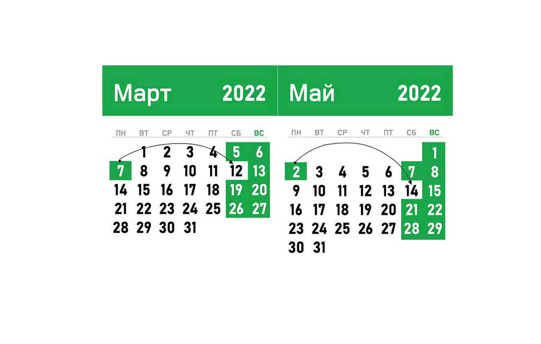 Понедельник 2 мая — на субботу 14 мая. При этом днями отдыха будут 30 апреля (суббота), 1 (воскресенье), 2 (понедельник) и 3 (вторник) мая 2022 года – 4 дня.
