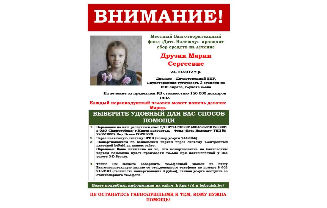 Местный Благотворительный фонд «Дать Надежду» проводит сбор средств на лечение Друзик Марии Сергеевне 24.10.2012 г.р. Диагноз – Двухсторонний ВПР. Двухсторонняя тугоухость 2 степени по ВОЗ справа, глухота слева