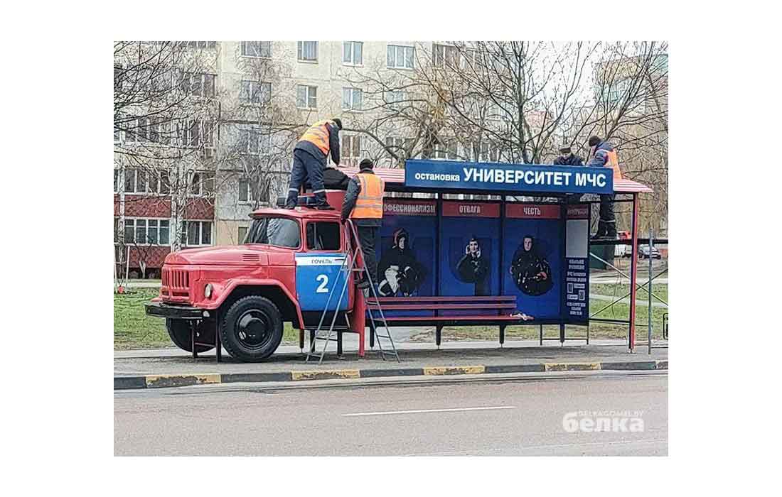 Как выглядит среднестатистическая автобусная остановка в Гомеле? Навес, скамейка, в лучшем случае — газетный киоск. В Советском районе к обычному месту ожидания транспорта подошли творчески. Навес превратился в кузов пожарной машины, к которому приварили кабину от отреставрированного ЗИЛа. Новый арт-объект появился на остановке «Университет МЧС».