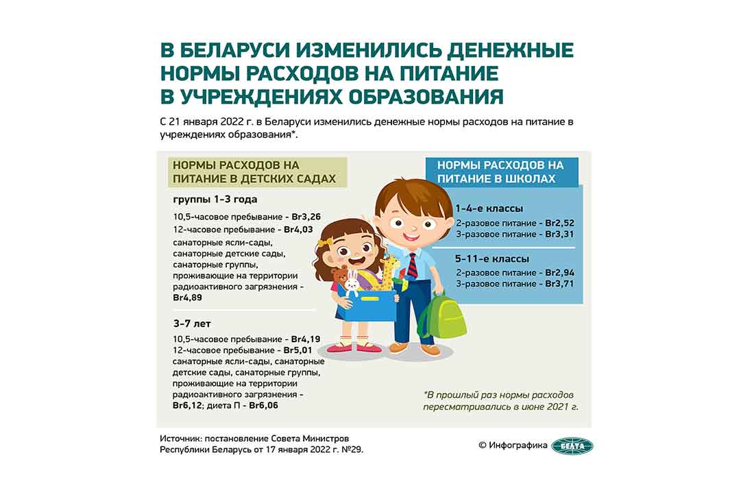 Инфографика 24.01.202201.02.2022 В Беларуси изменились денежные нормы расходов на питание в учреждениях образования Опубликовал: Лоевский край 0 Комментариев