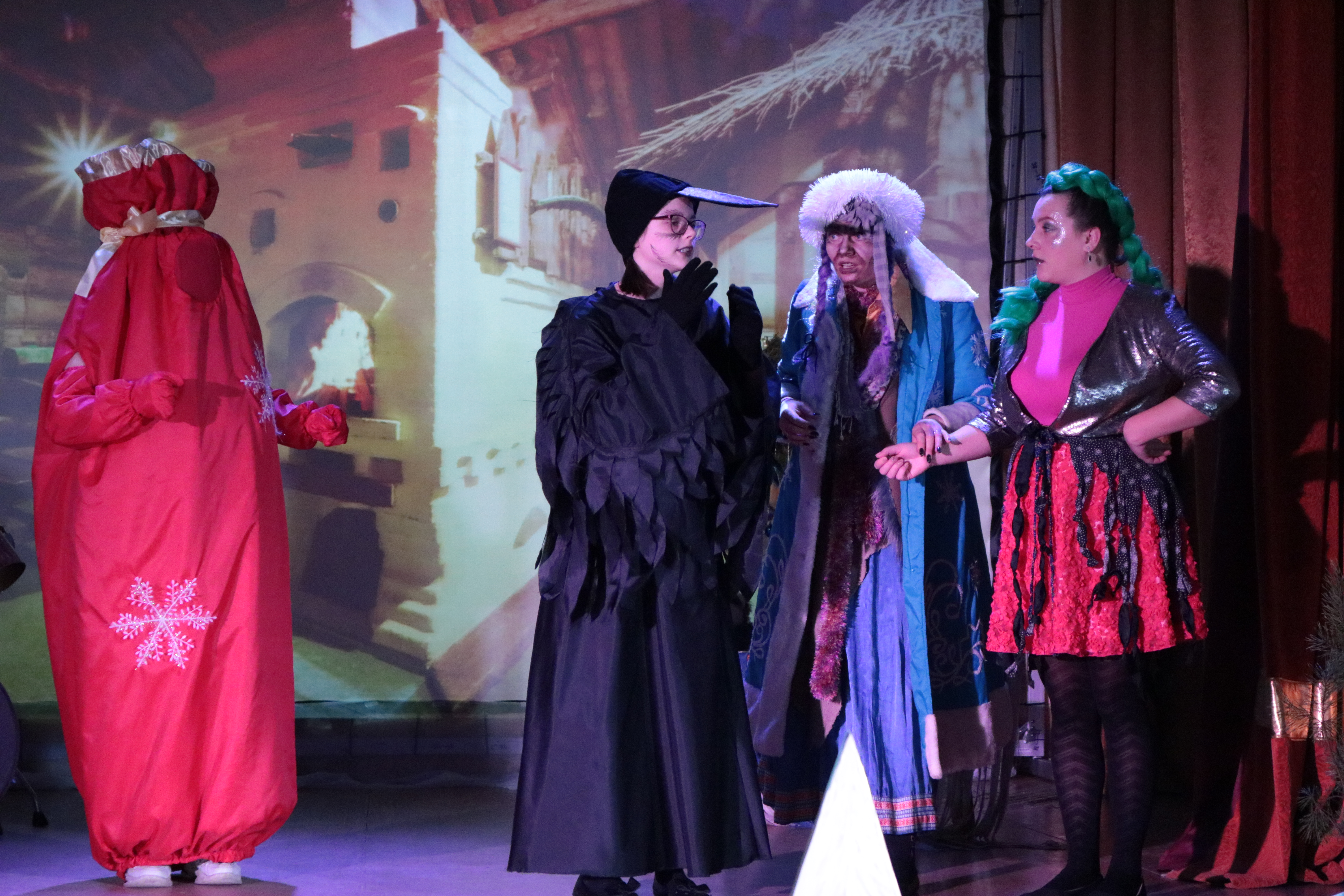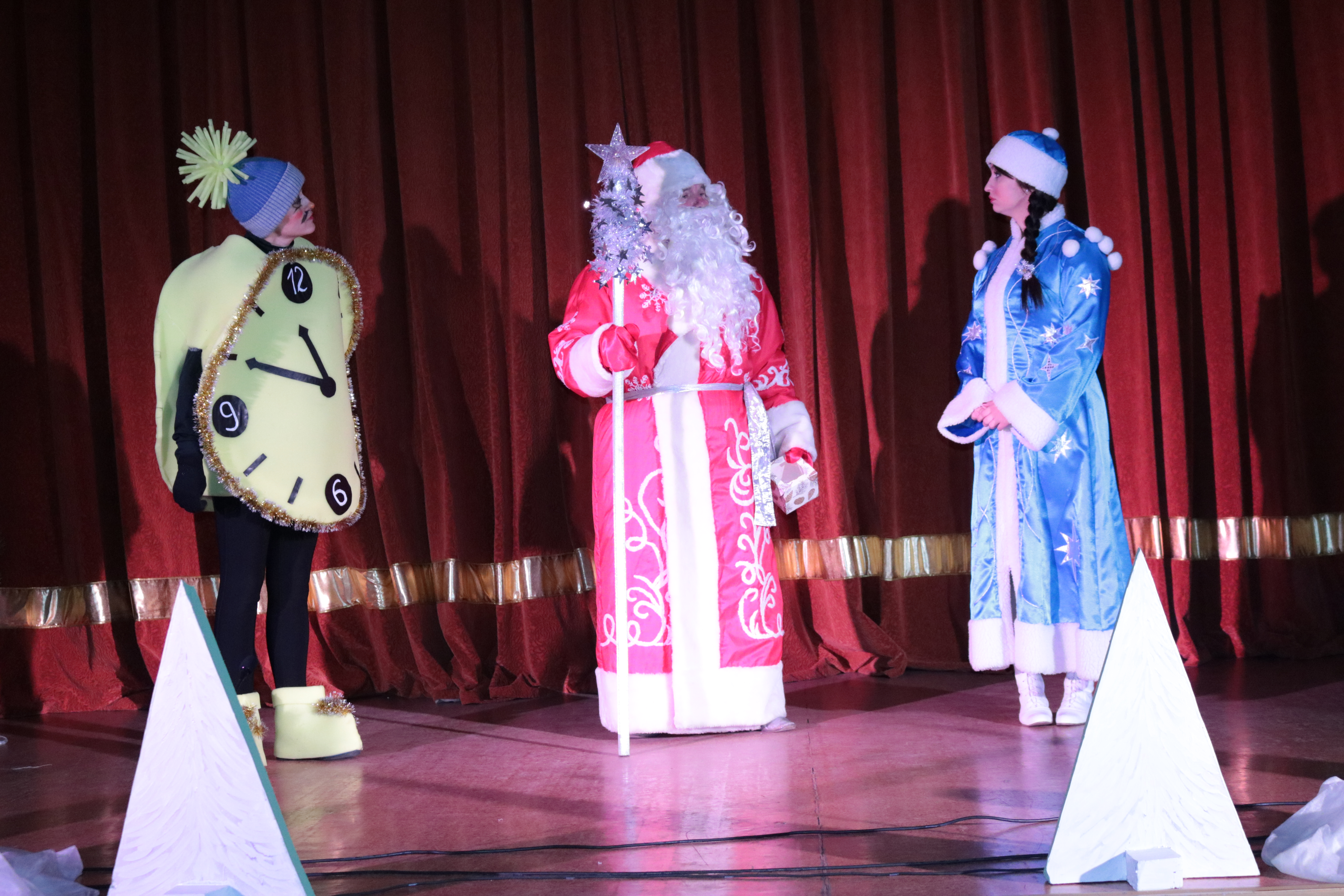 Долгожданной кульминацией праздника стало новогоднее представление «Приключения новогоднего мешка». Действие происходило в лесном государстве. В семье Лешего и Бабы-яги переполох: их родная дочь Кикимора решила стать звездой мирового масштаба. Но, как оказалось, у нее нет голоса. Кикимора день и ночь слезы льет — о славе мечтает. Родители захотели порадовать своего ребенка и воплотить ее мечту в реальность. Но не знали, как ее исполнить. А Ворона взболтнула, что новогодний мешок Деда Мороза может осуществить любые желания. Баба-яга с Лешим вздохнули с облегчением и решили выкрасть волшебный мешок. Но все же им не удалось провернуть злодеяние и оставить детей без подарков. Леший и Баба-яга попросили у Деда Мороза и Снегурочки прощение за свои проказы, а он в свою очередь с помощью волшебного снежка осуществил заветную мечту Кикиморы. Как всегда, добро восторжествовало над злом, а сокровенное желание исполнилось не по взмаху волшебной палочки, а благодаря упорному труду.