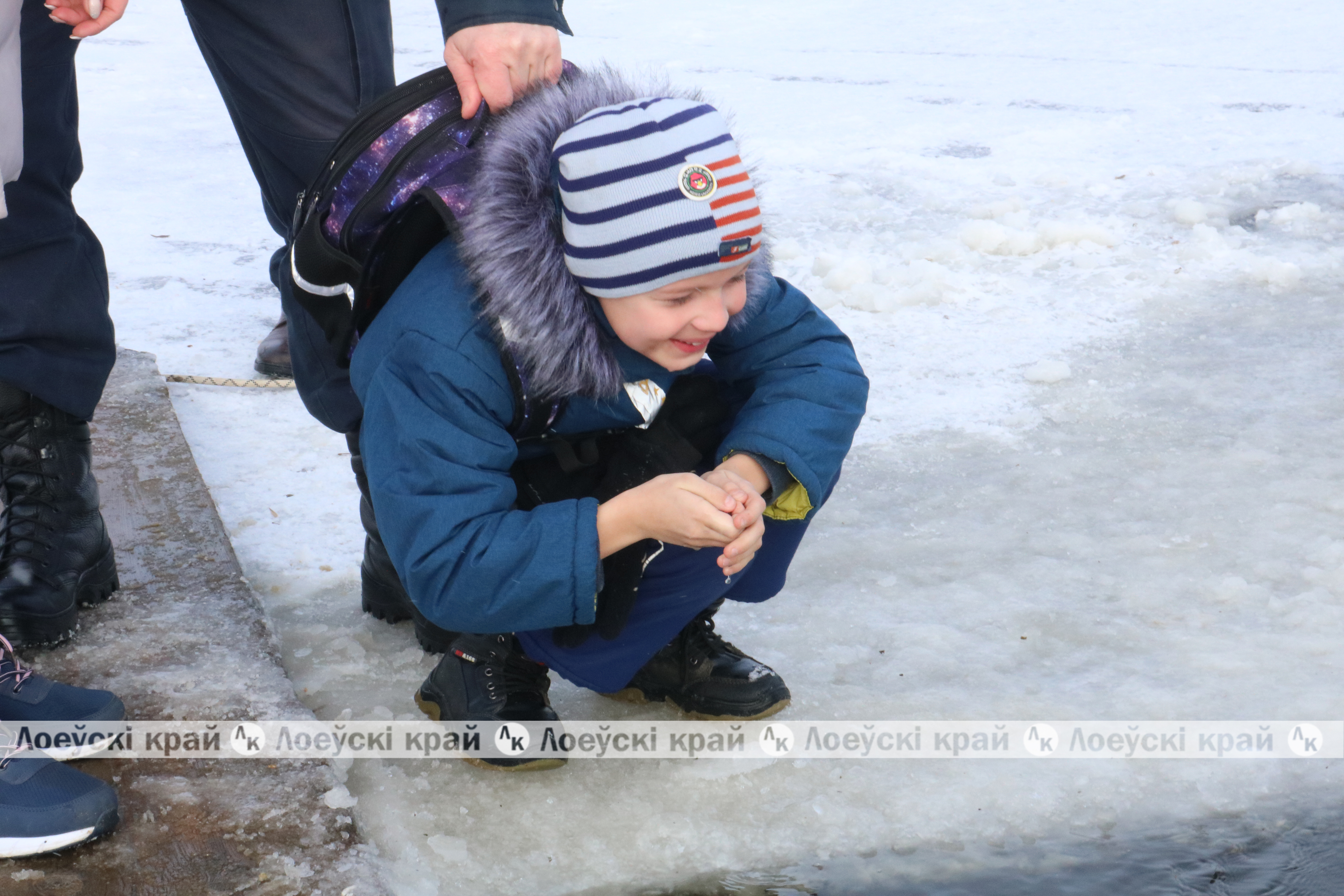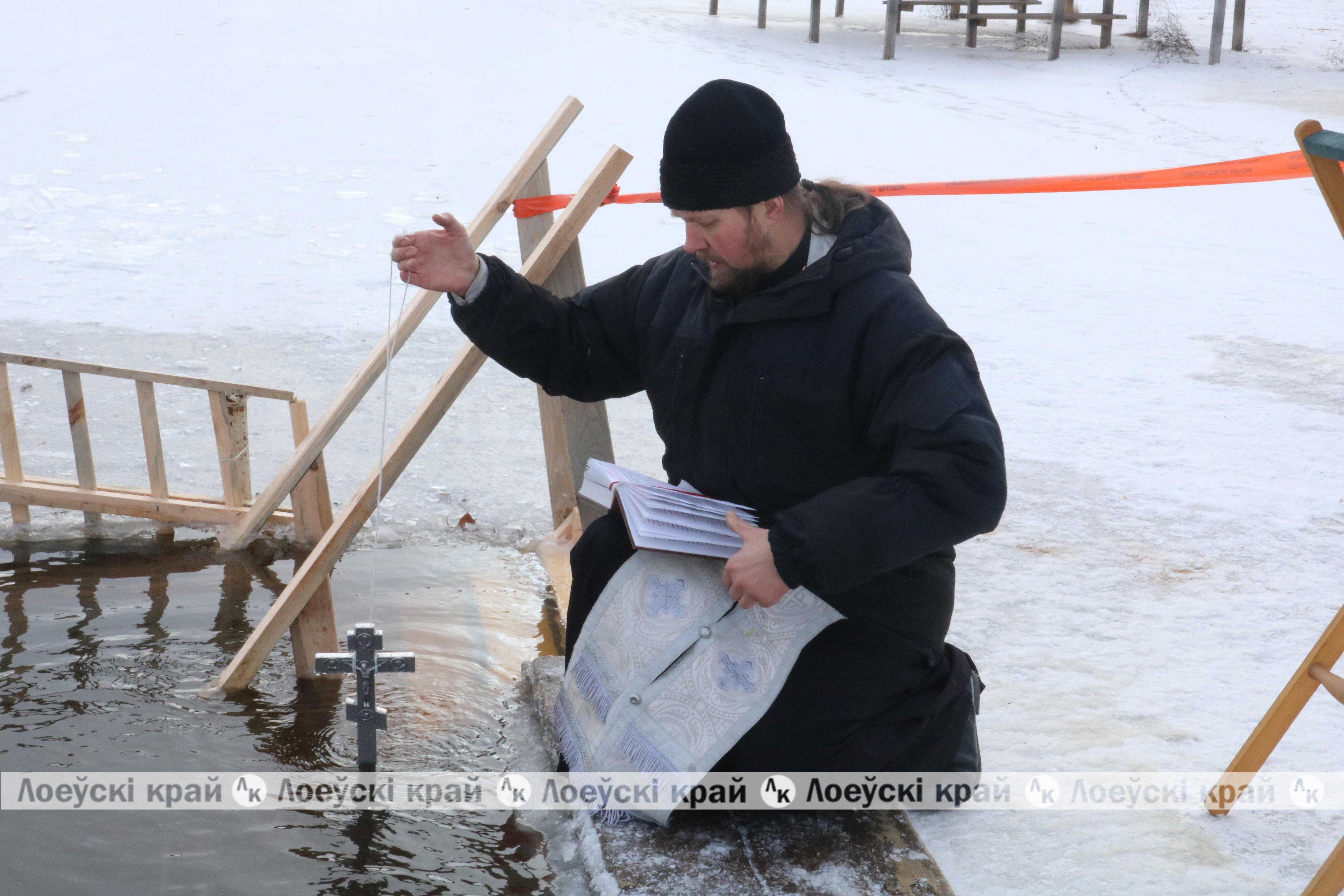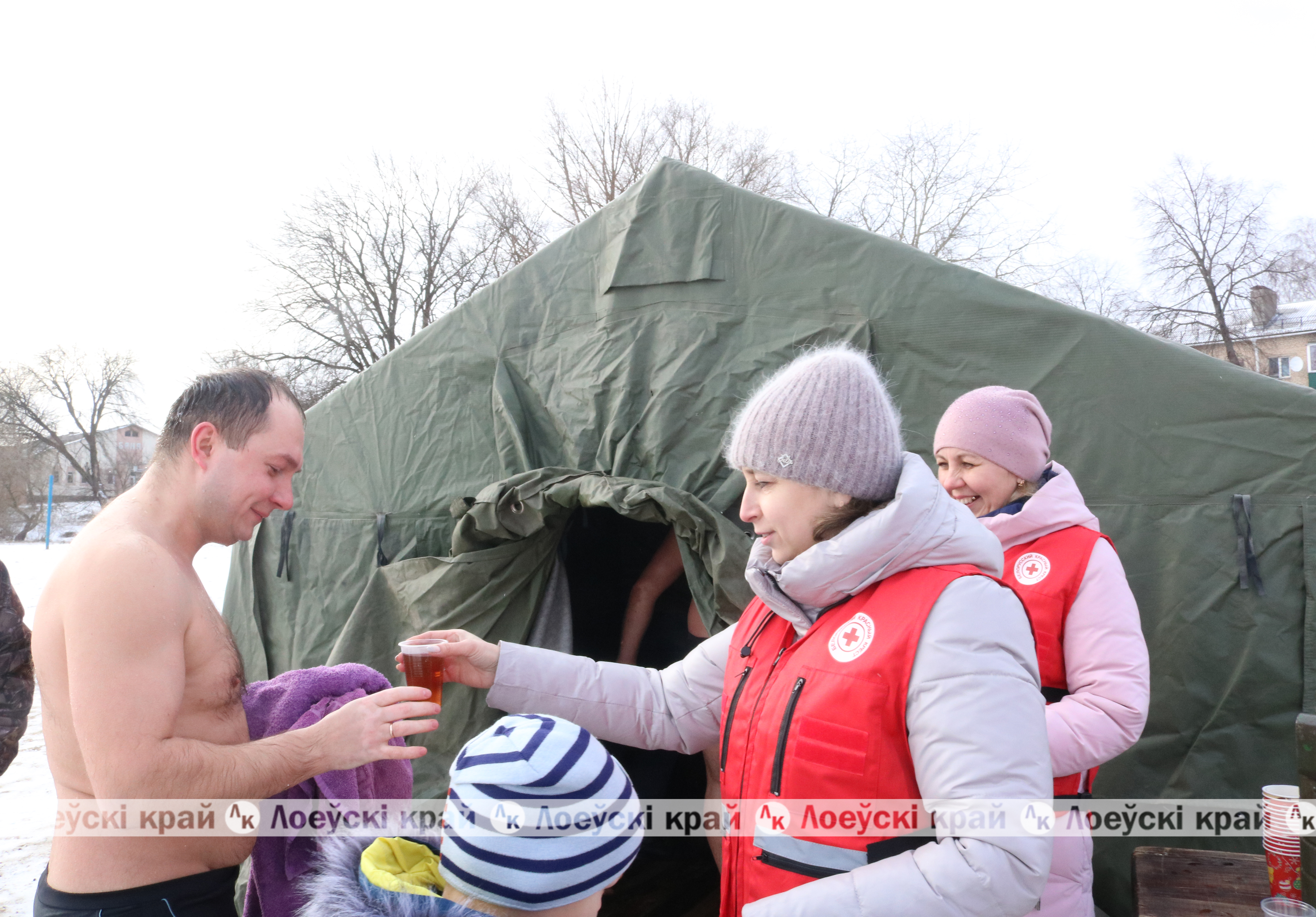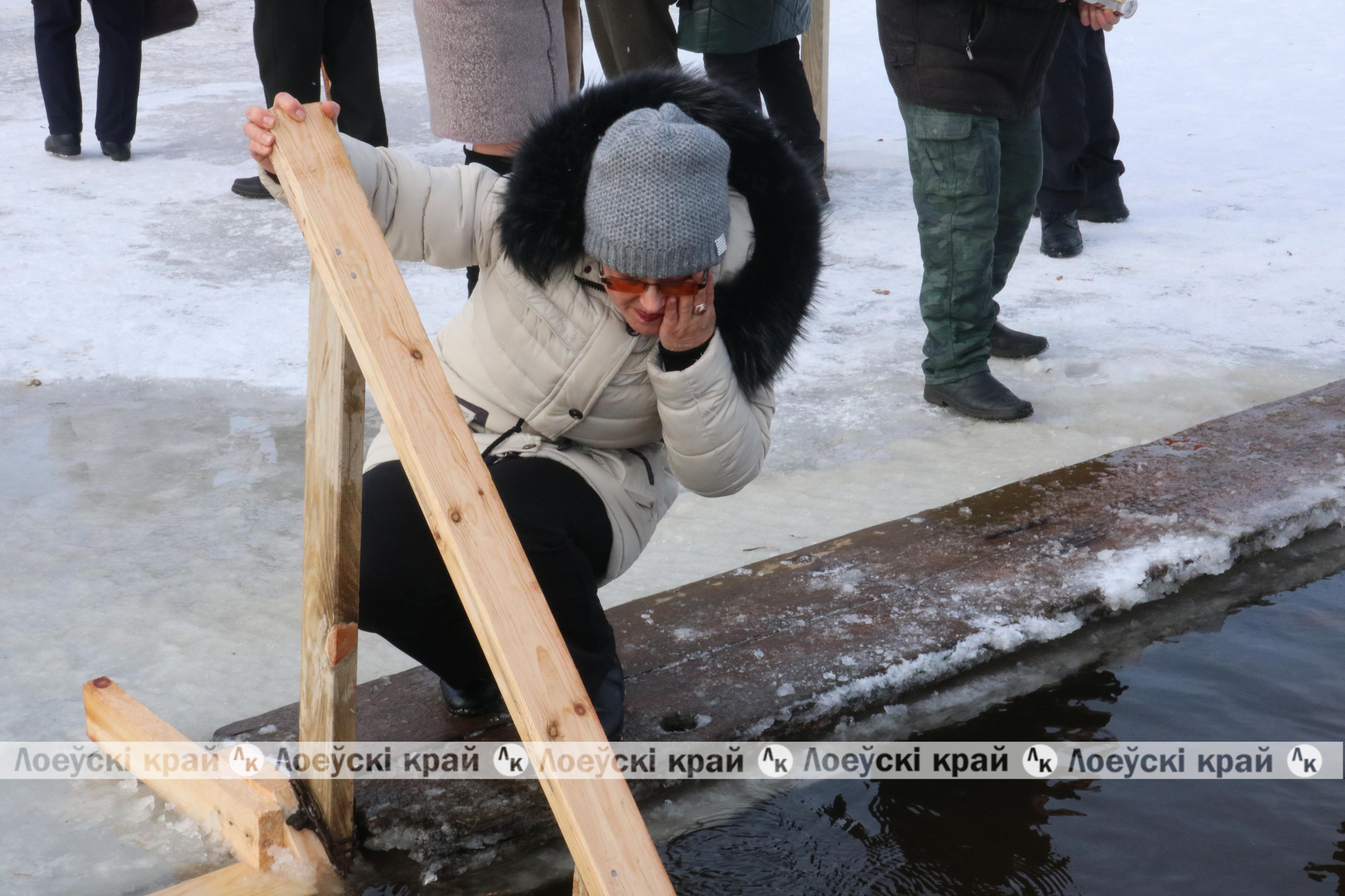 Накануне праздника работники Лоевской спасательной станции ОСВОД и сотрудники РОЧС подготовили прорубь на городском пляже. В среду её освящение провёл благочинный церквей Лоевского округа иерей Димитрий Чварков. Надо сказать, что время мероприятия было выбрано оптимально — 13.00, поскольку в этот час у многих лоевчан перерыв на обед. Поэтому на берегу Днепра собралось достаточно много жителей райцентра, желающих увидеть освещение купели и окунания земляков. Следует отметить, что в этом году погодные условия сопутствовали смельчакам: температура воды — -20С, воздуха — -40С, небольшой снежок и безветрие. Словом, абсолютный штиль. Желающих прикоснуться к необычной традиции нашлось много, среди них в объектив корреспондента «ЛК» попали девушка и паренёк лет восьми. Конечно, ощущения от окунания в ледяную воду у всех были схожие. Об этом присутствующим поведали невольные возгласы купающихся. Собравшиеся в свою очередь поддерживали их шутками и ободряющими словами. Спасатели подставляли руку помощи входящим и выходящим из воды взрослым, склонившимся к купели детям и пожилым людям. Здесь же было организовано дежурство медиков отделения скорой помощи райбольницы, установлена палатка для обогрева и переодевания купающихся. Рядом с ней расположились активисты районной организации Белорусского Общества Красного Креста, предлагавшие горячий чай всем желающим.