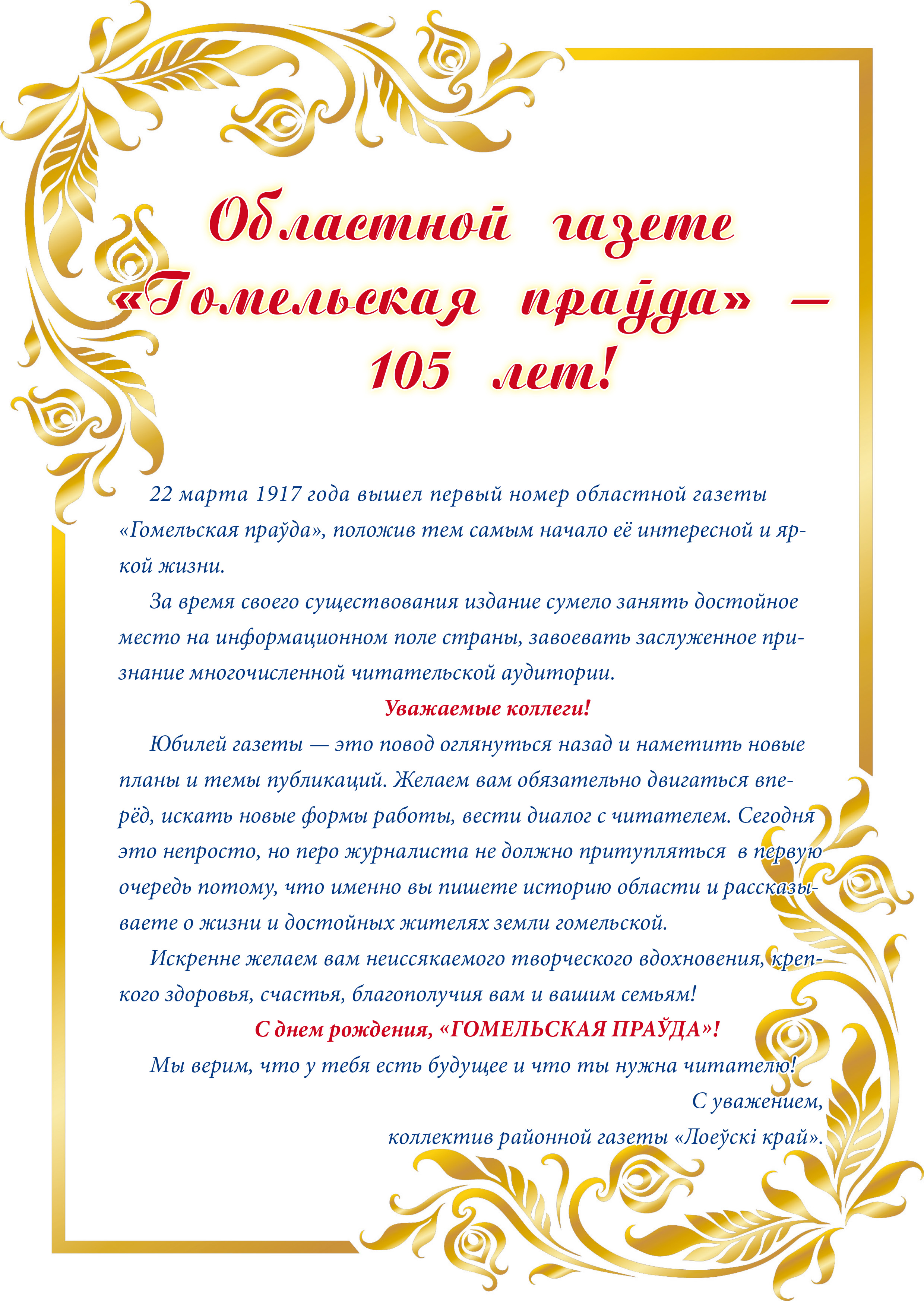 Общество 22.03.202222.03.2022 Областной газете «Гомельская праўда» — 105 лет! Опубликовал: Лоевский край 0 Комментариев