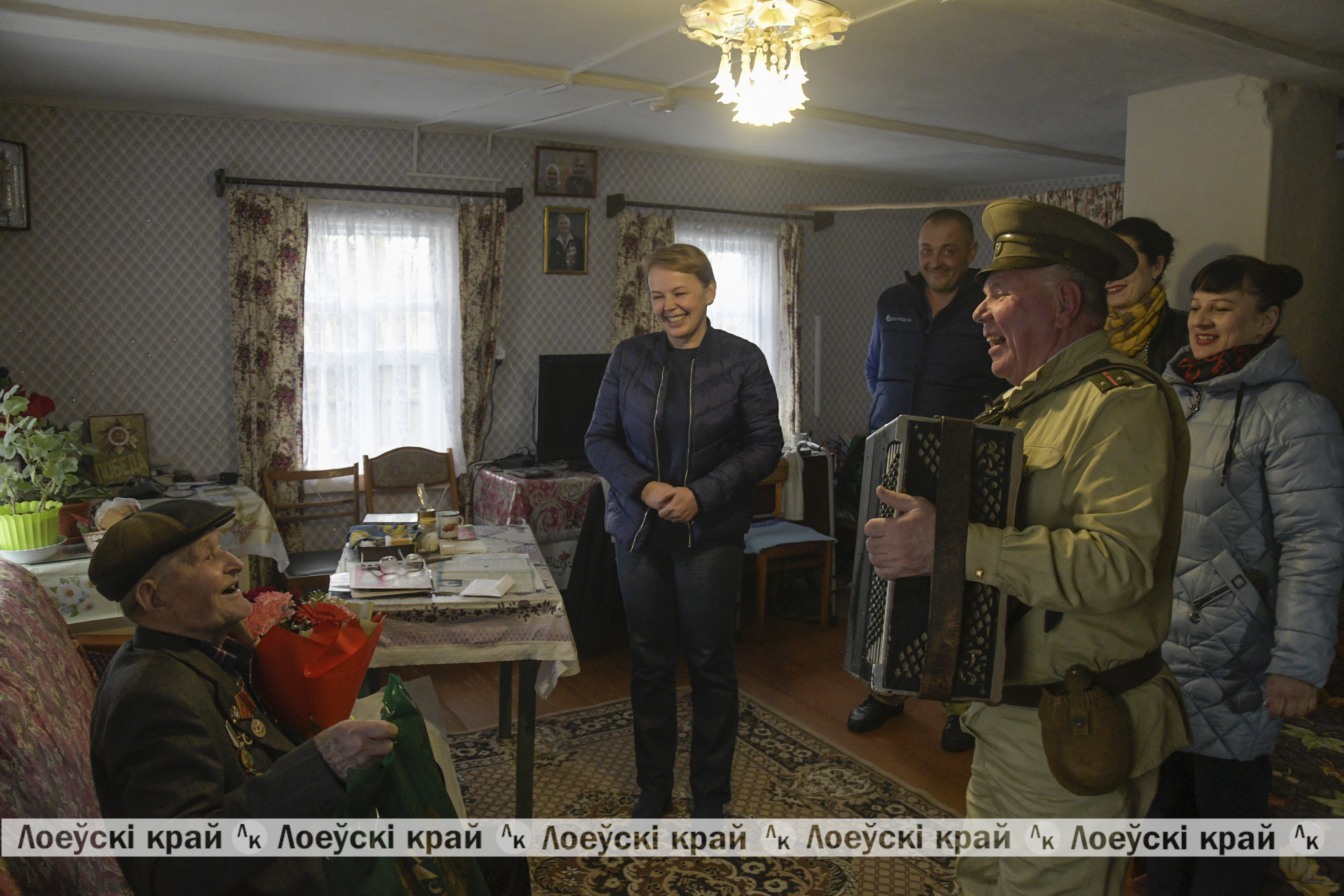 В адрес героя в этот день прозвучали слова благодарности за подвиг, светлое будущее и мирное небо над головой. Ветерану вручили материальную помощь, назначенную по Указу Президента Республики Беларусь №281, а самодеятельные артисты ГЦК подарили ему музыкальный подарок.