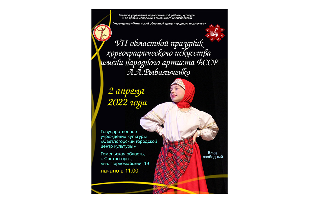 2 и 3 апреля 2022 года состоится VII областной праздник хореографического искусства имени народного артиста БССР А.А.Рыбальченко. Праздник проводится с целью увековечивания памяти народного