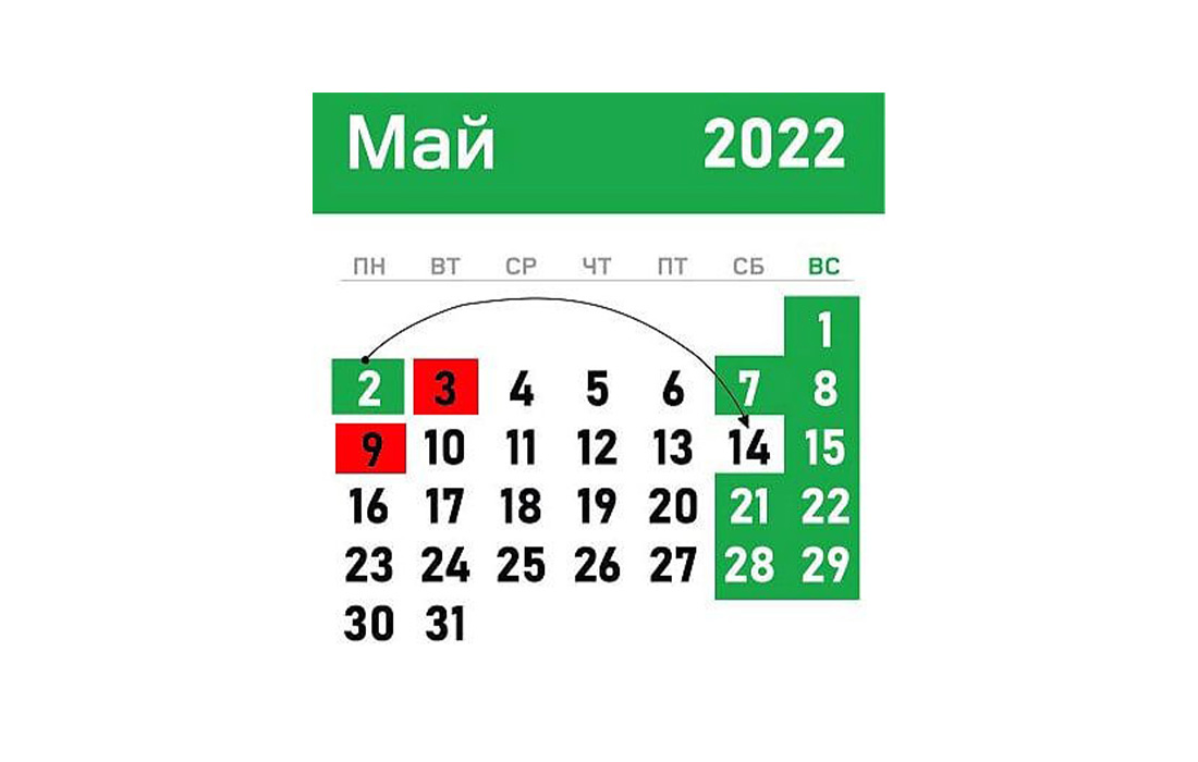 Рабочий день с понедельника 2 мая переносится на субботу 14 мая. Таким образом, с субботы 30 апреля по 3 мая, у белорусов будет четыре