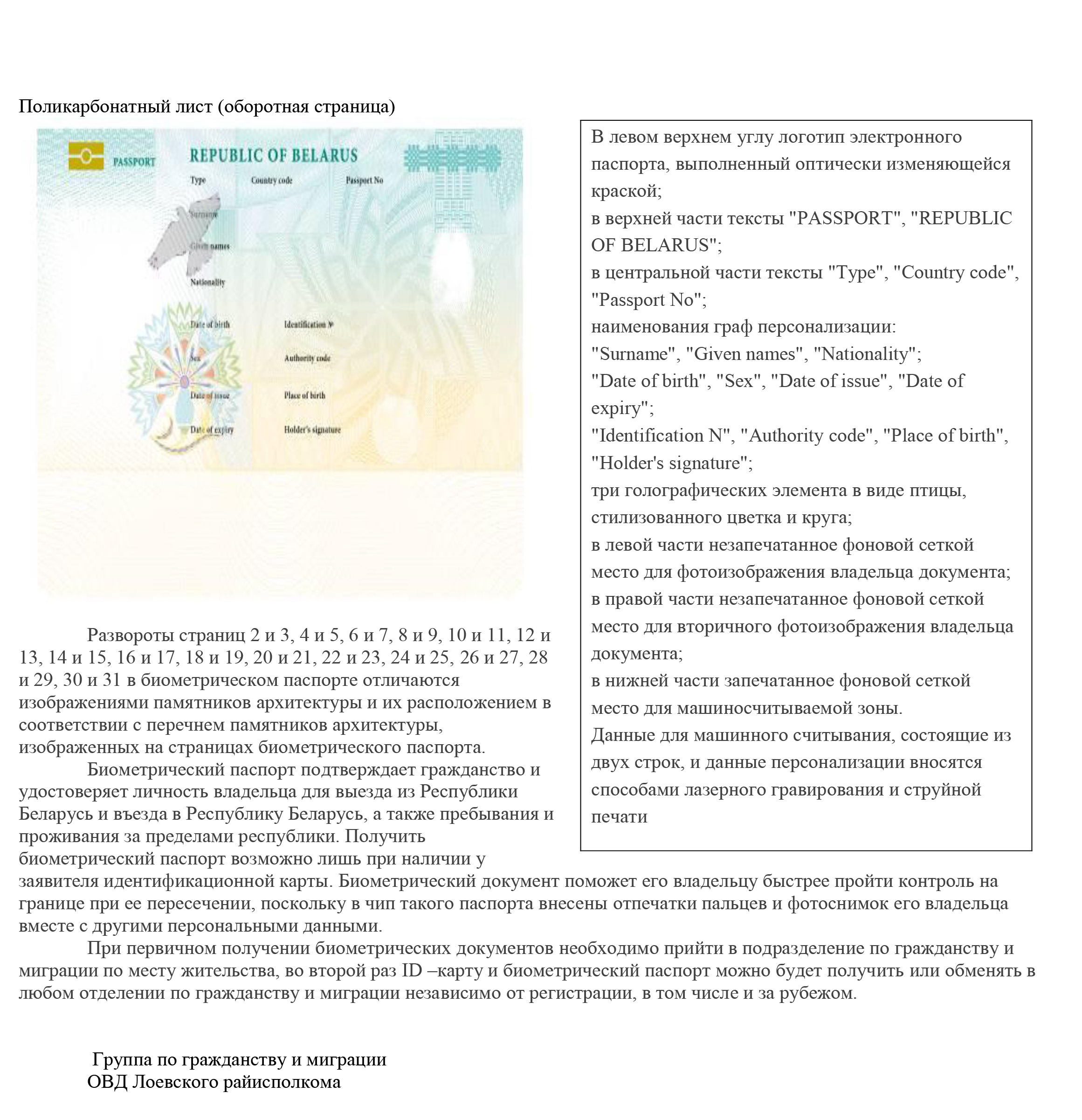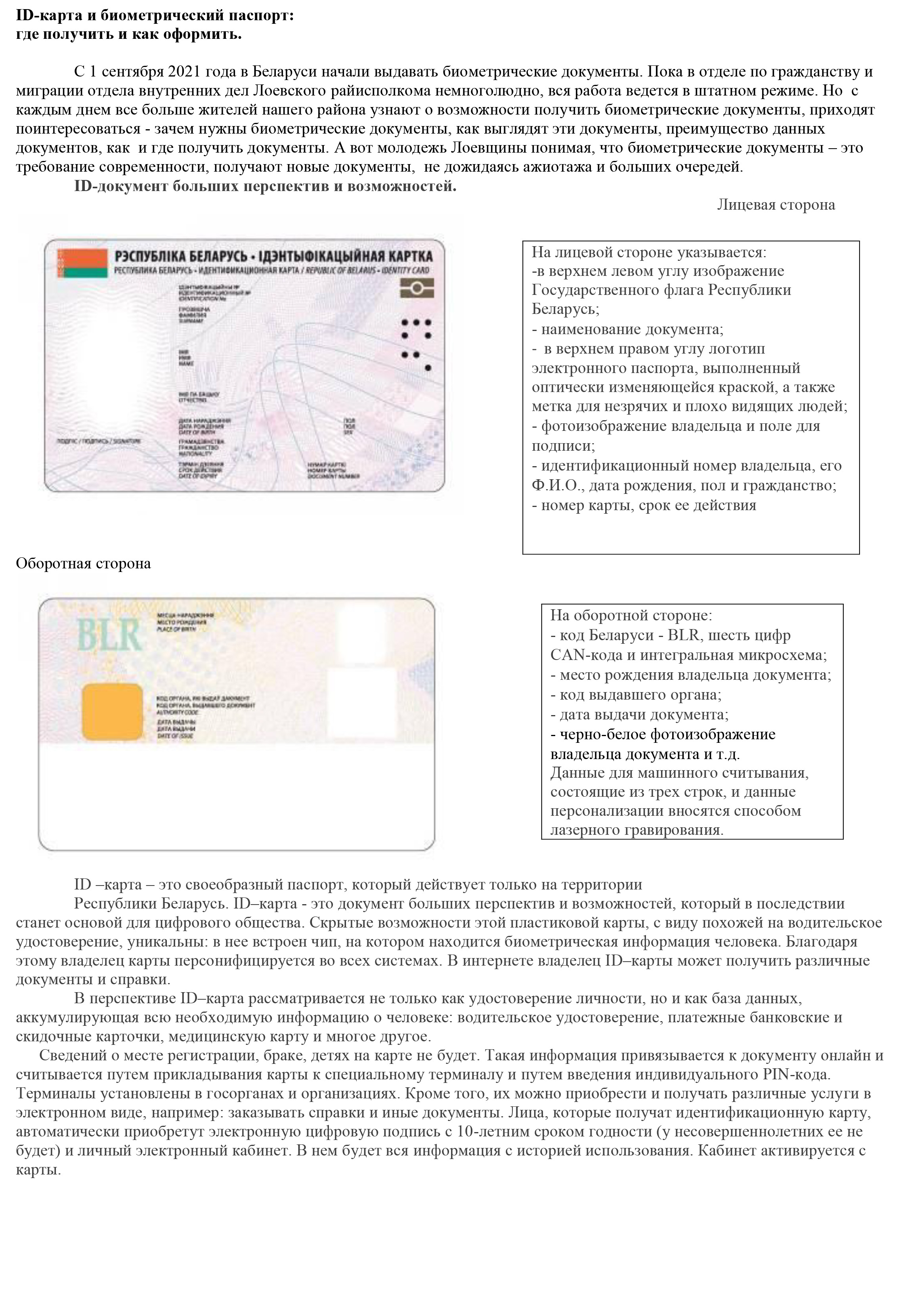 Республики Беларусь. ID–карта — это документ больших перспектив и возможностей, который в последствии станет основой для цифрового общества. Скрытые возможности этой пластиковой карты, с виду похожей на водительское удостоверение, уникальны: в нее встроен чип, на котором находится биометрическая информация человека. Благодаря этому владелец карты персонифицируется во всех системах. В интернете владелец ID–карты может получить различные документы и справки.