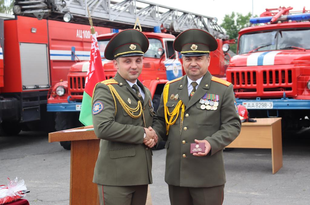 Председатель Совета первичной ветеранской организации БОО «Спасатель» майор запаса Андрей Левкович поздравил коллегу с выходом на заслуженный отдых и вручил награду «Ветеранская благодарность».