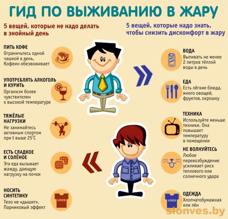 Небывало жаркая погода диктует свои правила поведения, пренебрегать которыми чревато для здоровья человека. Особенно плохо переносят эту температурную аномалию лица, страдающие хроническими заболеваниями, беременные и кормящие женщины, пожилые люди, маленькие дети. Подростки находятся также в группе риска: у них процессы терморегуляции не очень устойчивы. Поэтому, когда температура воздуха прогревается свыше 30оС, врачи рекомендуют время для прогулок — до 10.00 и после 17.00.