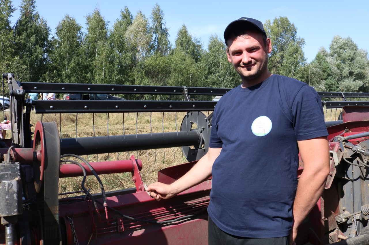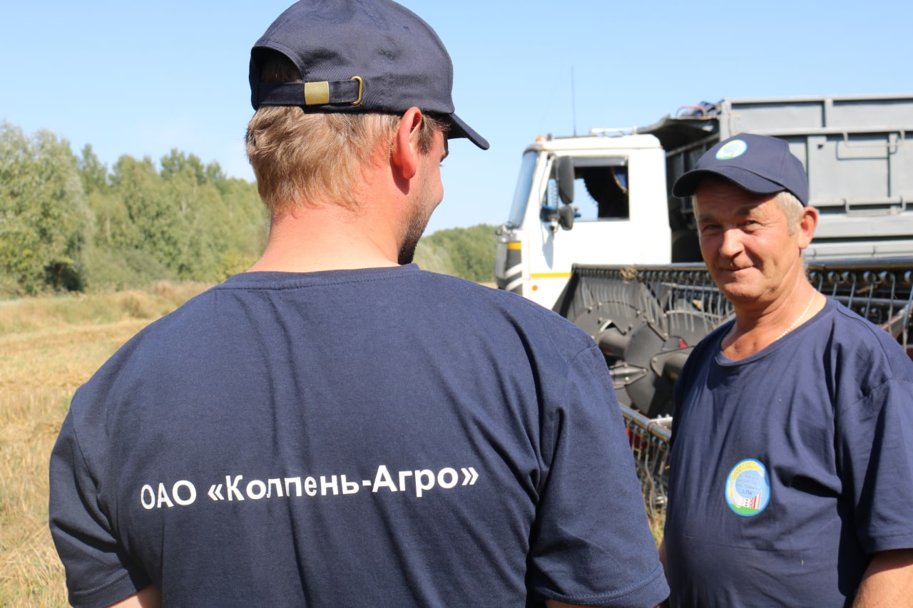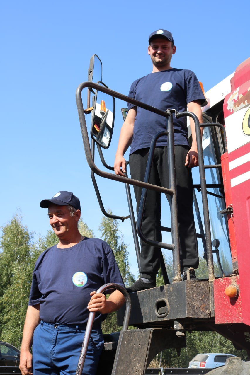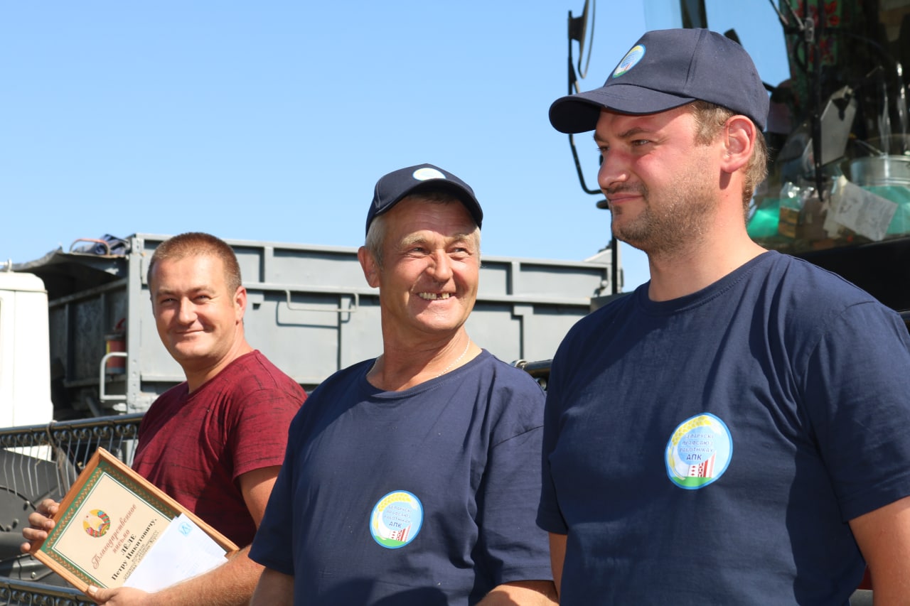 Герои уборочной страды: экипаж в составе Якова Гайдука и Дениса Карася, водителя на отвозке зерна Петра Лёля из ОАО «КОЛПЕНЬ-Агро».