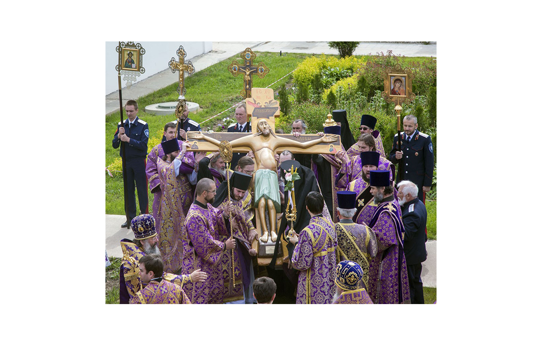 В 1940 году верующими крест был перенесен из закрытого Крестовоздвиженского храма (впоследствии частично разобранного на хозяйственные нужды, ныне восстановленного как мужской монастырь Животворящего Креста села Погост Крест Ивановской области) в храм святителя Иоанна Златоуста села Годеново нынешней Ярославской области. В 1997 году Златоустовский храм стал подворьем Переславского Никольского женского монастыря и к 2008 году был полностью отреставрирован.