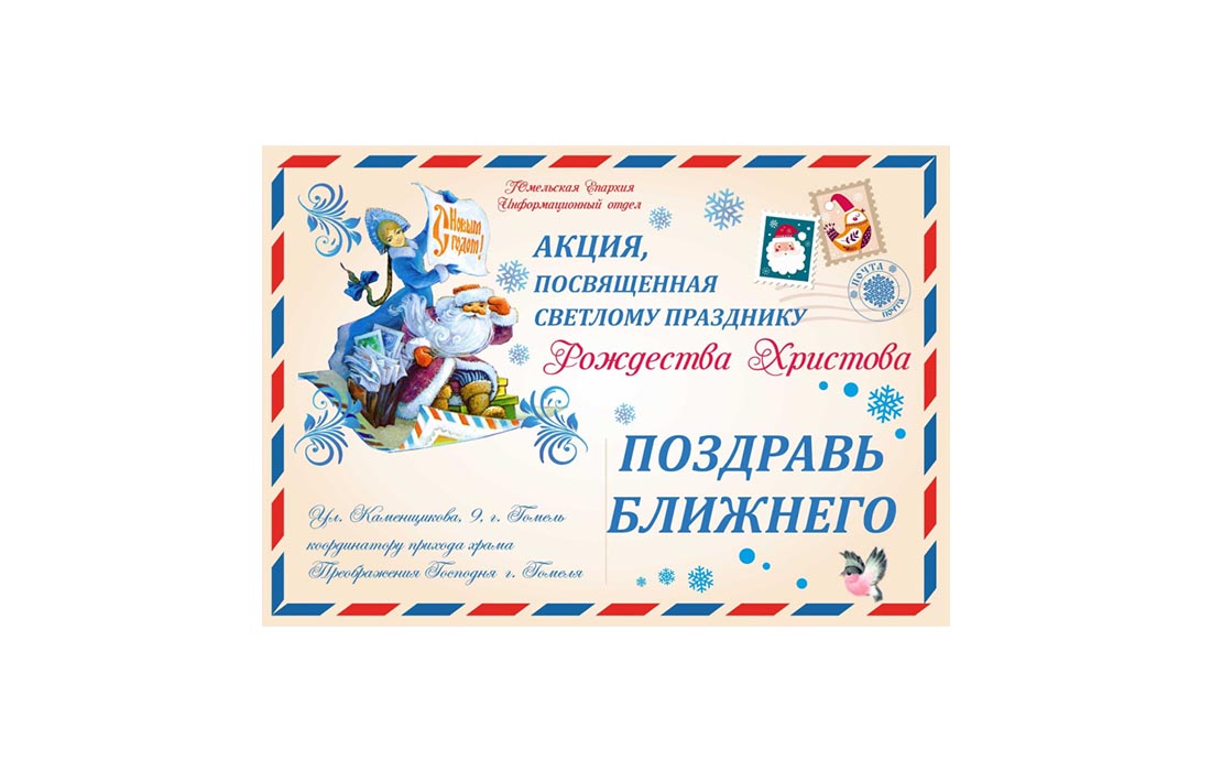 По традиции школьники, воспитанники дошкольных учреждений образования и студенты пишут письма с поздравлениями и в не заклеенном конверте с почтовой маркой передают координатору прихода храма Преображения Господня в Гомеле по адресу: г. Гомель, ул. Каменщикова, 9.