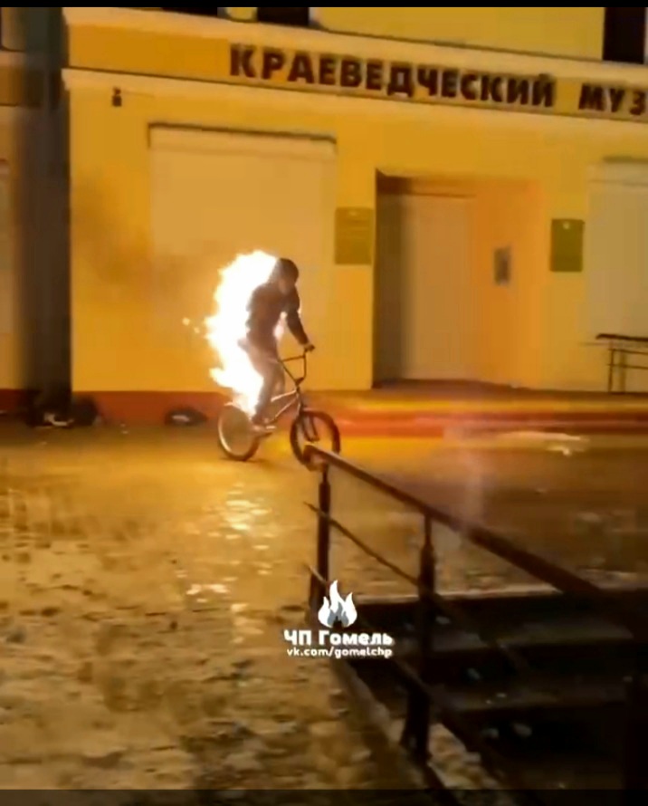 В соцсетях завирусилось видео, в котором 17-летний речичанин поджег себя и сделал трюки на велосипеде. Заранее слив бензин из мотоцикла деда, парень с друзьями пошел искать подходящее для трюка место. Остановились на крыльце местного музея. Юноша надел на себя несколько курток и облился бензином. Приятель чиркнул зажигалкой, и жидкость воспламенилась. Трюк сделать с первого раза не получилось: колесо велосипеда повело на льду. Второй дубль оказался удачным. По счастливой случайности никто не пострадал. По факту инцидента проводится проверка, милиция даст правовую оценку действиям парня. К слову, он нигде не работает и не учится. Напомним, в середине июня 2020 года в Гомеле подросток поджег на себе одежду и нырнул в воду. Тогда на парня составили протокол за мелкое хулиганство.