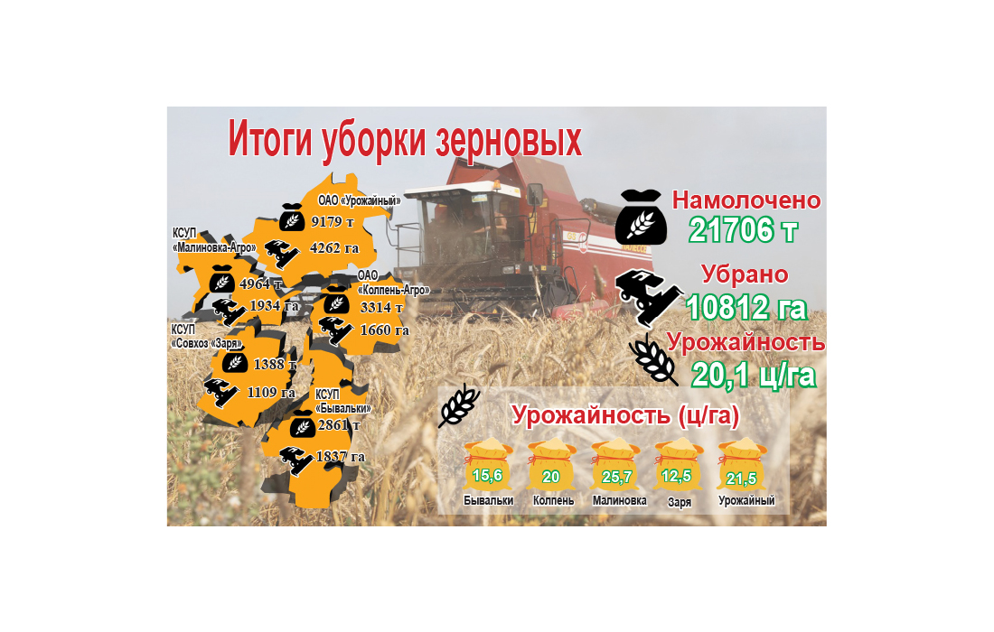Средняя урожайность зерновых по району — 20,1 ц/га. Больше всех удалось намолотить зерна аграриям из ОАО «Урожайный» — валовый сбор составил 9179 т, при этом в среднем с гектара здесь намолочено 21,5 ц. Лучшая средняя урожайность на круг — у коллектива КСУП «Малиновка-Агро» (25,7 ц/га).