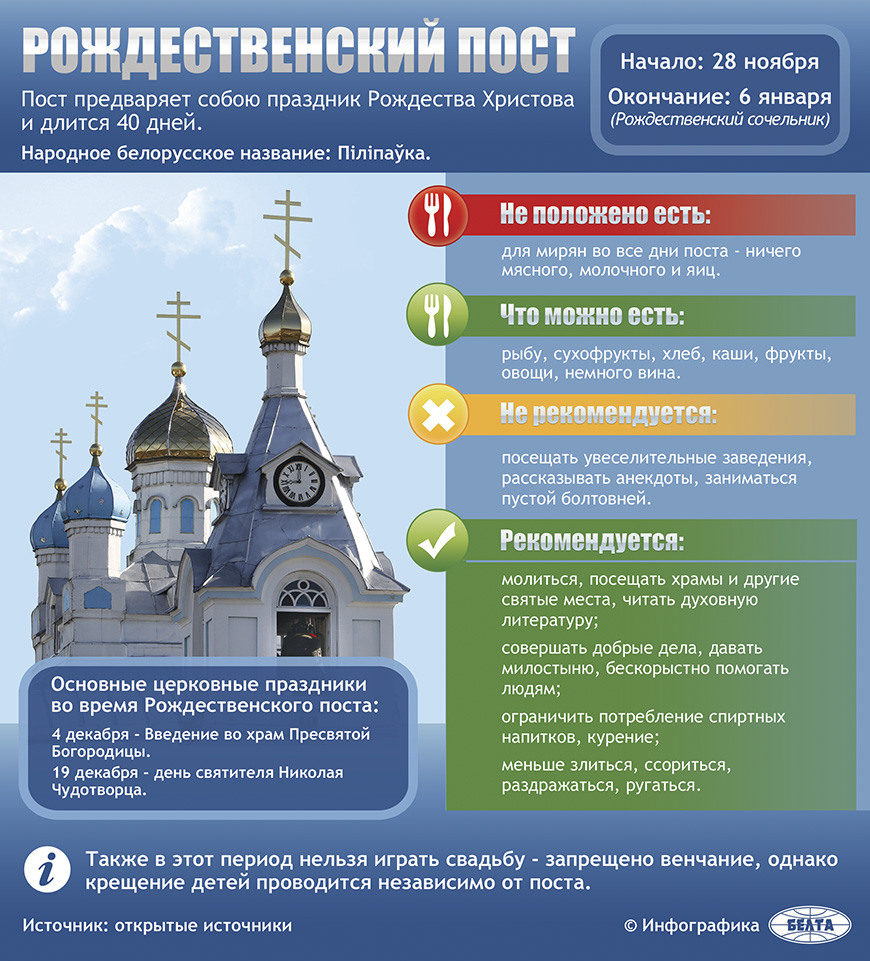 Рождественский пост менее строгий, чем Великий и Успенский. Начинается 28 ноября и длится сорок дней по 6 января включительно.