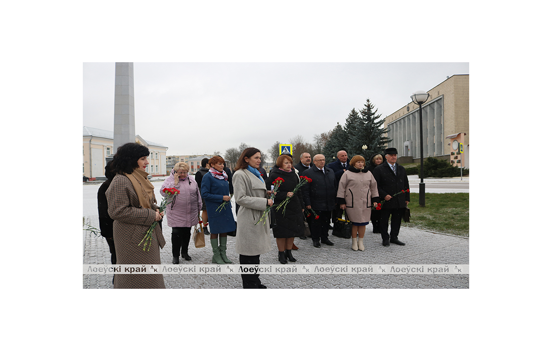 Знакомство с Лоевом началось с посещения братского захоронения, где покоятся 544 советских солдата, сложивших свои головы на полях сражений за Лоевщину. Присутствующие почтили память героев-освободителей минутой молчания и возложили цветы к подножию мемориала.
