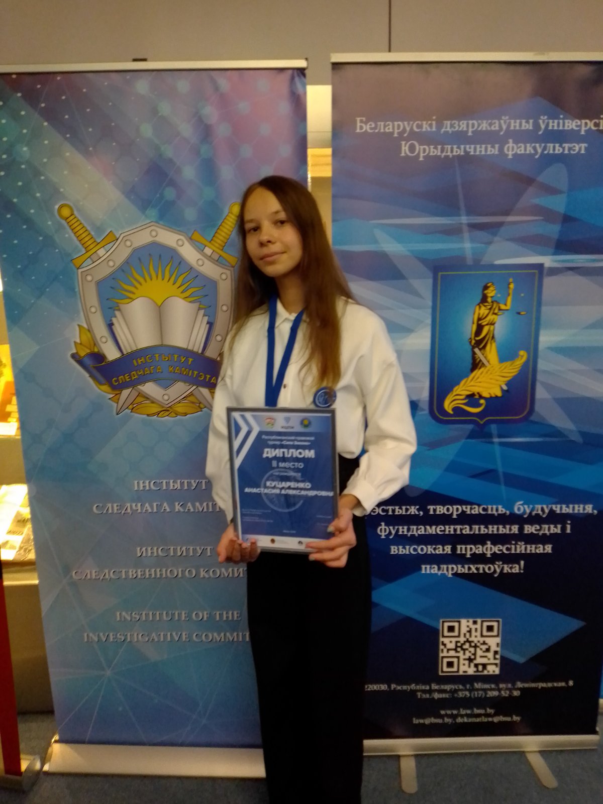 На днях завершился II Республиканский правовой турнир для старшеклассников «Сила закона», организаторами которого выступили БРСМ, Министерство образования, Национальный центр правовой информации. На заключительном этапе наш район представляла учащаяся районной гимназии Анастасия Куцаренко, которая оказалась в тройке лидеров, завоевав диплом II степени.