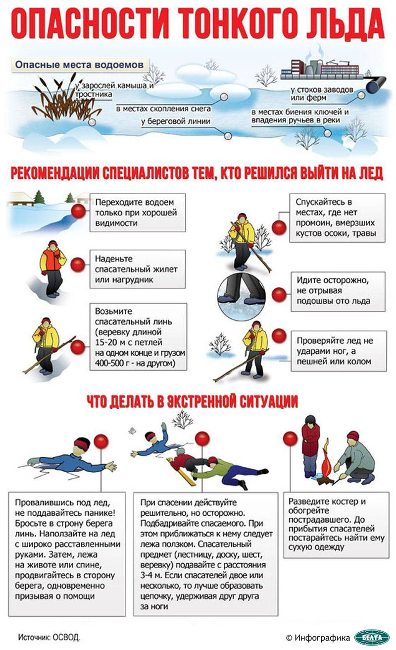 Помните, первый лед непрочен. Выходить на такой лед опасно для жизни. Грязный, буро-серый цвет льда говорит о его непрочности. Безопасным считается лед толщиной не менее 20 см. Он должен быть зеленого или голубовато-зеленого цвета. Не стоит проверять прочность льда, прыгая на нем или ударяя ногой. Кроме того, отправляясь на зимнюю рыбалку, необходимо правильно экипироваться. Возьмите с собой минимальный набор спасательных средств: веревку, палку, доску, спасательный жилет и шилья. Обязательно поговорите с детьми об опасности игр на льду. Ни в коем случае не отпускайте одних на водоемы.