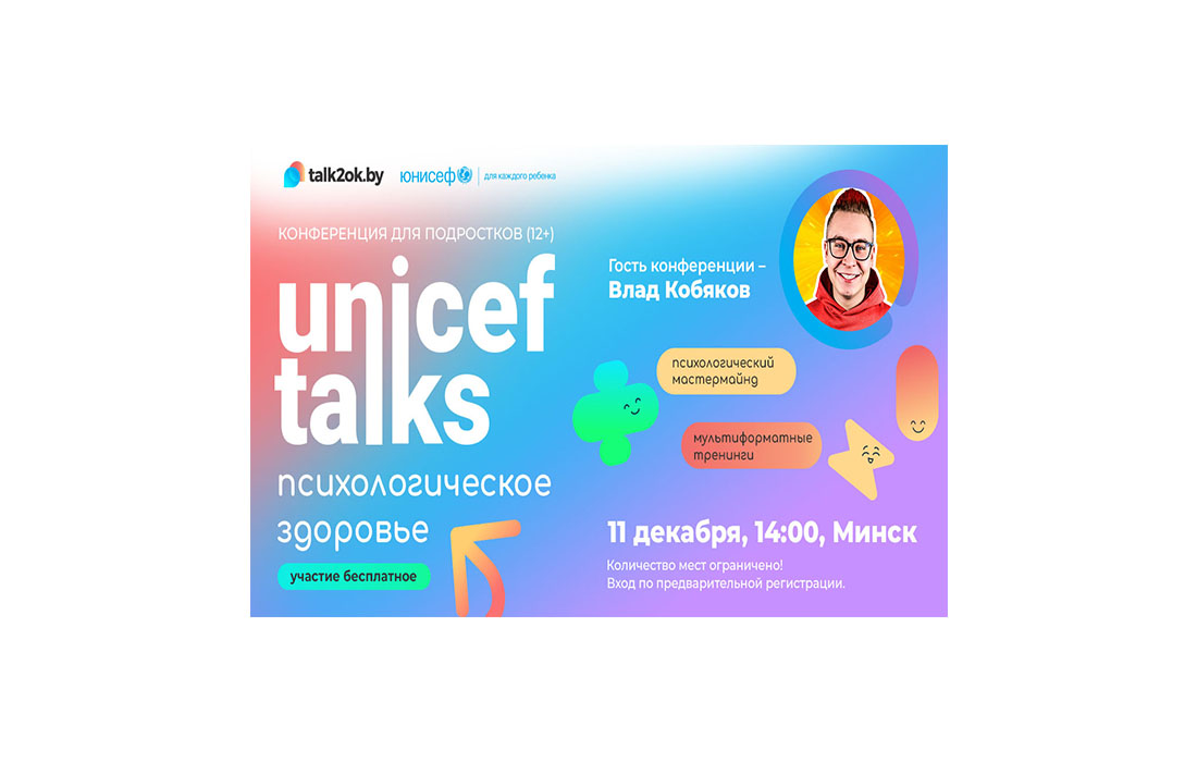11 декабря в свой день рождения Детский фонд ООН (ЮНИСЕФ) в Беларуси проведет масштабную конференцию для подростков UNICEF Talks по теме психологического здоровья. В программе – лекции психологов, интерактивные квизы, честные разговоры – все, чтобы поддержать молодых людей, рассказать, что обращаться за помощью – это нормально, и поделиться инструментами помощи. Например, информацией о платформе talk2ok.by, где каждый подросток может получить консультацию психолога бесплатно и конфиденциально, а также поддержку от сверстников.