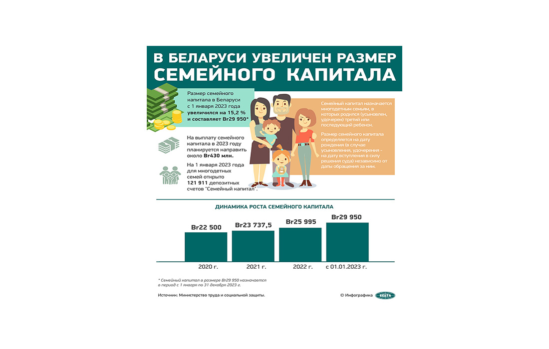 Размер семейного капитала в Беларуси с 1 января 2023 года увеличился на 15,2 % и составляет Br29 950*.