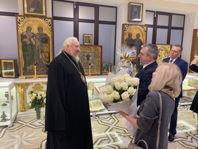 Высокопреосвященнейший Стефан, архиепископ Гомельский и Жлобинский за активное взаимодействие с Гомельской епархией вручил медаль “1030-летние Православия на белорусских землях” председателю Гомельского областного исполнительного комитета Ивану Крупко.