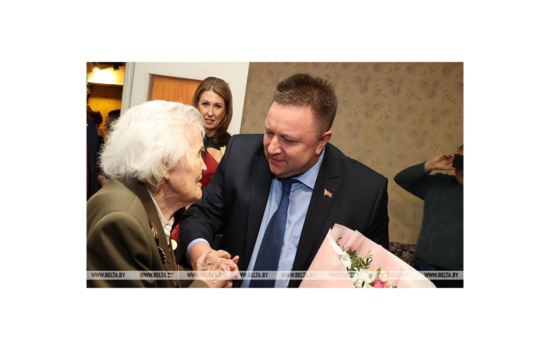 Одну из многочисленных делегаций, которые сегодня посещают ветерана, возглавил помощник Президента — инспектор по Минску Александр Барсуков. Узнав об этом, Евгения Коновалова рассказала, что чувствовала в 2020 году, когда была «заваруха эта чертова», как переживала за главу государства. Также призналась, что Президент был для нее примером того, как себя вести в подобных обстоятельствах. «Молодец, выстоял», — отметила женщина.