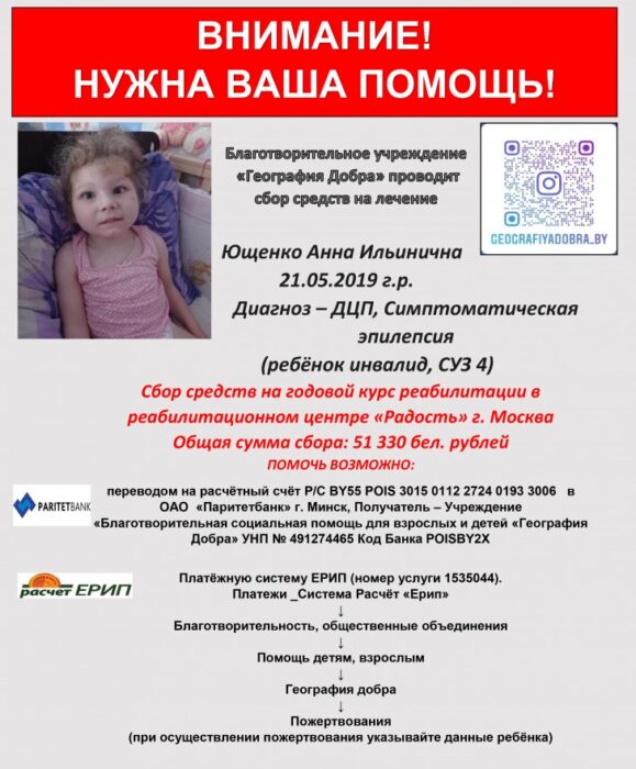 Помочь в лечении и реабилитации девочки Ани возможно переводом на расчётный счёт Р/С BY55 POIS3015 0112 2724 0193 3006 в ОАО «Паритетбанк» г. Минск, Получатель – Учреждение «Благотворительная социальная помощь для взрослых и детей «География Добра» УНП № 491274465 Код Банка POISBY2X, а также через Платёжную систему ЕРИП (номер услуги 1535044).