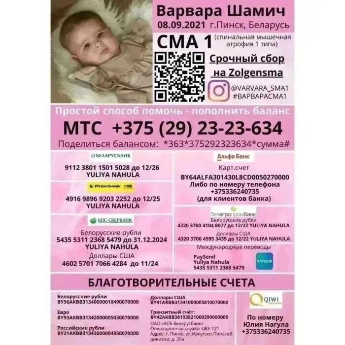 У моей единственной дочери, Шамич Варвары Андреевны (08.09.2021 г.р., г. Пинск), в 2,5 месяца диагностировано тяжелое генетическое заболевание — спинально-мышечная атрофия 1 типа.