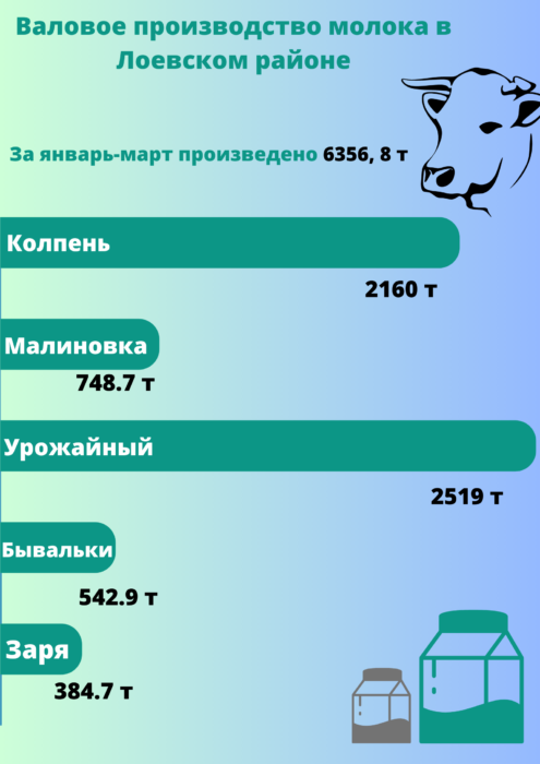 За три месяца текущего года сельхозпредприятия произвели 6356 т молока, что на 5,2% меньше аналогичного периода 2022 г.  Как рассказал заместитель начальника управления сельского хозяйства и продовольствия райисполкома по животноводству Павел Ибрагимов, положительная динамика сложилась лишь в двух хозяйствах района. Больше всех прибавили в КСУП «Совхоз «Заря» — 121, 2% и КСУП «Малиновка-Агро» — 104,4%. В тоже время некоторые организации не достигли прошлогоднего уровня по производству продукции. Незначительно отстали животноводы ОАО «Колпень-Агро» — 97,7%, однако несмотря на небольшой «минус», по объему произведенного молока они входят в число лидеров района (2160 т). В аутсайдерах находятся КСУП «Бывальки» — 93,2% и ОАО «Урожайный» — 87,7%. Несмотря на падение последнее сельхозпредприятие произвело 2519,8 т молока.