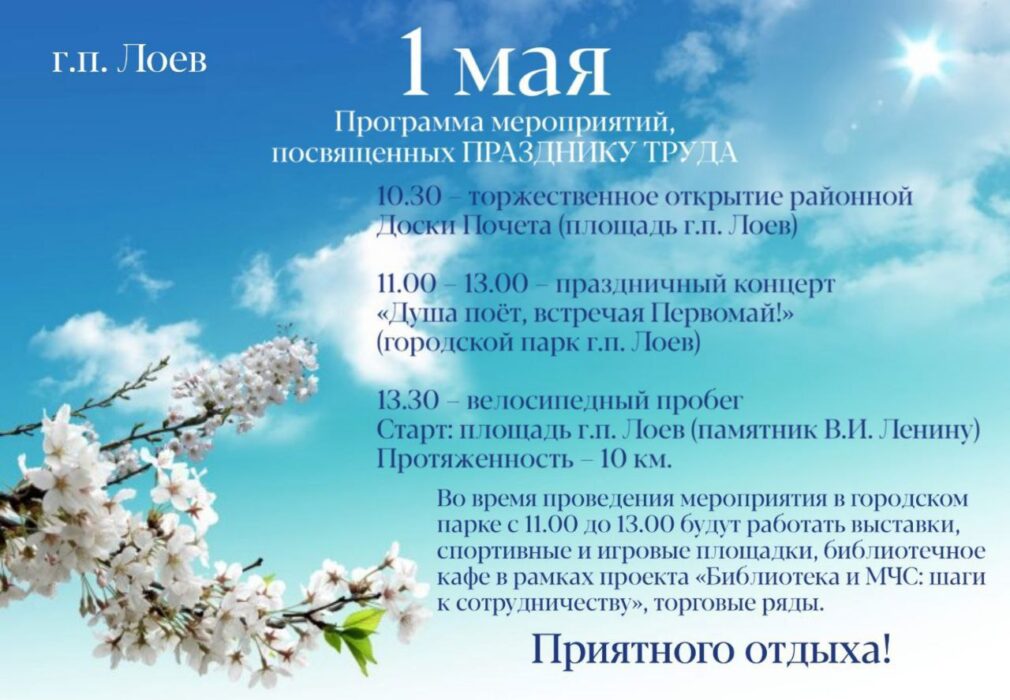 Инфографика 28.04.202329.04.2023 ПРОГРАММА МЕРОПРИЯТИЙ, ПОСВЯЩЕННЫХ ПРАЗДНИКУ ТРУДА Опубликовал: Лоевский край
