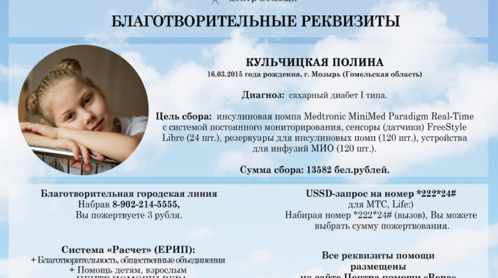 Кульчицкая Полина 16.03.2015 года рождения, г. Мозырь (Гомельская область) Диагноз: сахарный диабет I типа. Цель сбора: инсулиновая помпа Medtronic MiniMed Paradigm Real-Time c системой постоянного мониторирования,
