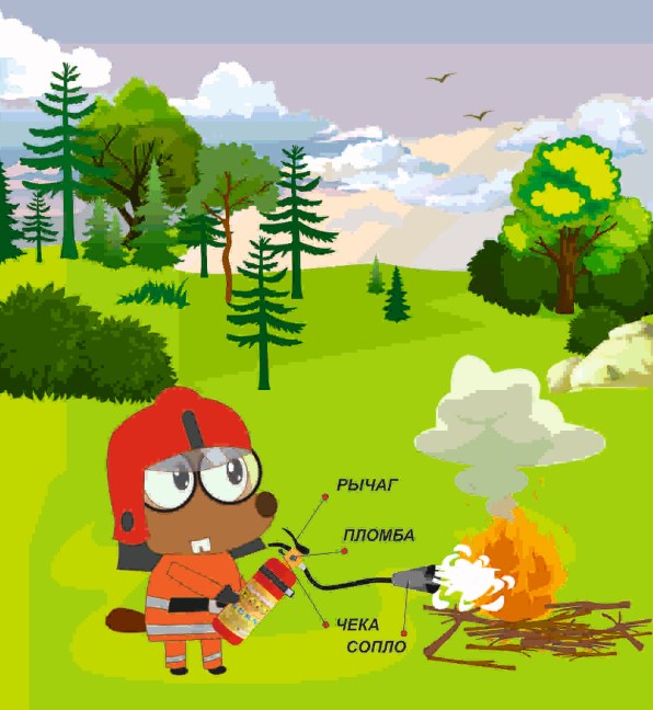Задание 4. Однажды, прогуливаясь по лесу, умный Бобр заметил в лесу непотушенный костер. Как раз на этот случай у него с собой был огнетушитель, давай поможем нашему юному другу разобраться, какие действия нужно выполнить, чтобы потушить огонь? Поставь по порядку цифры.