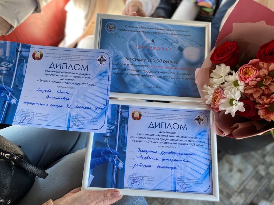 По итогам состязаний звание «Лучшей медицинской сестры 2023 года» среди учреждений здравоохранения Гомельской области удостоена Инга Пинчук — медсестра Гомельской областной детской клинической больницы. И хотя наша Ольга Глезова не вошла в тройку победителей, лоевчане вернулись домой с наградами. В номинации конкурса «Лучшая команда поддержки» были отмечены болельщики Лоевской ЦРБ. Диплом, цветы и сертификат на сумму от 160 рублей им вручила председатель Гомельской областной организации Белорусского профсоюза работников здравоохранения Надежда Зимина.