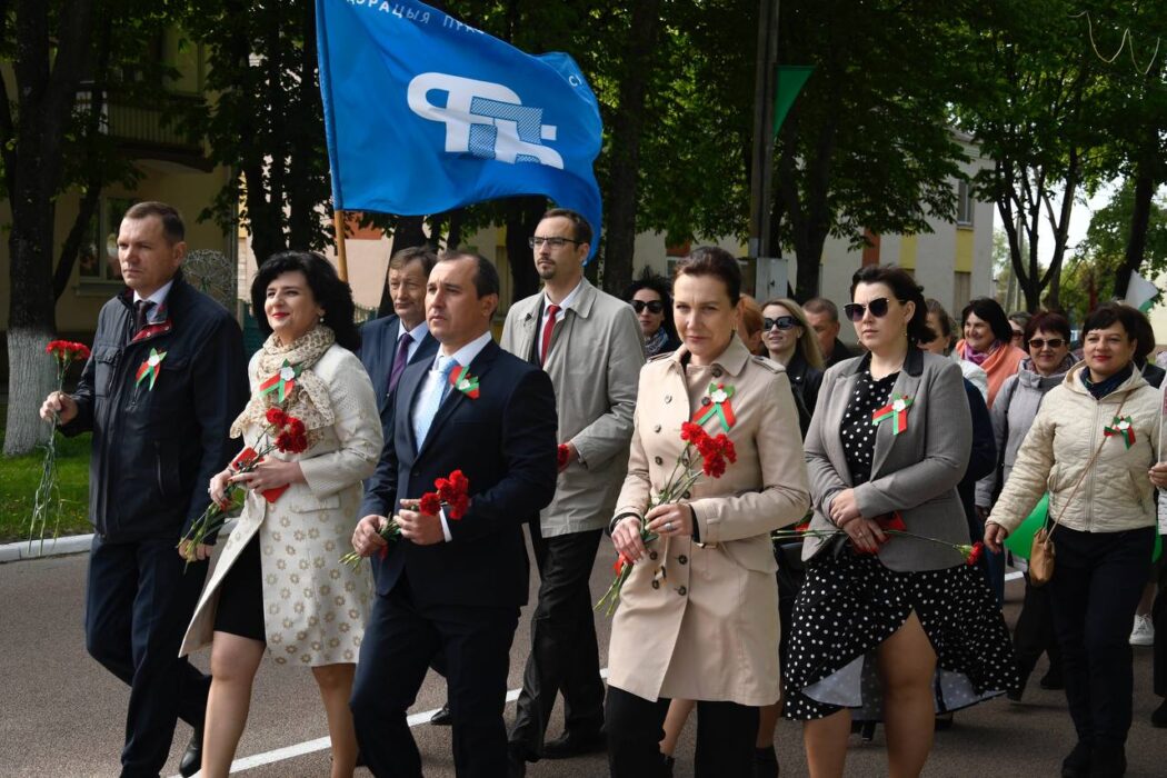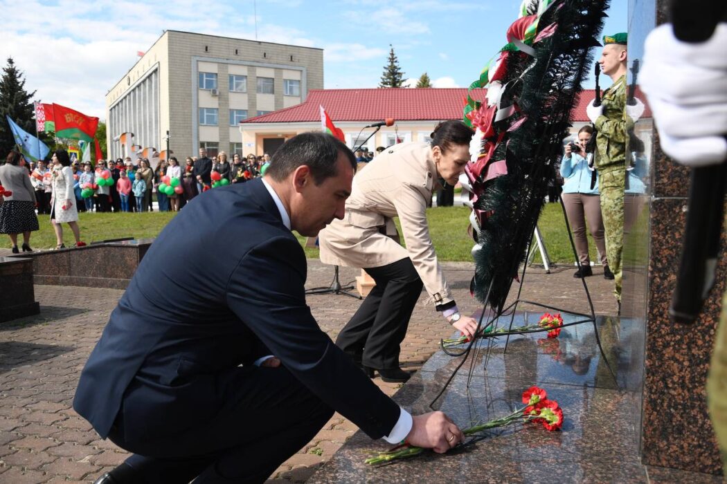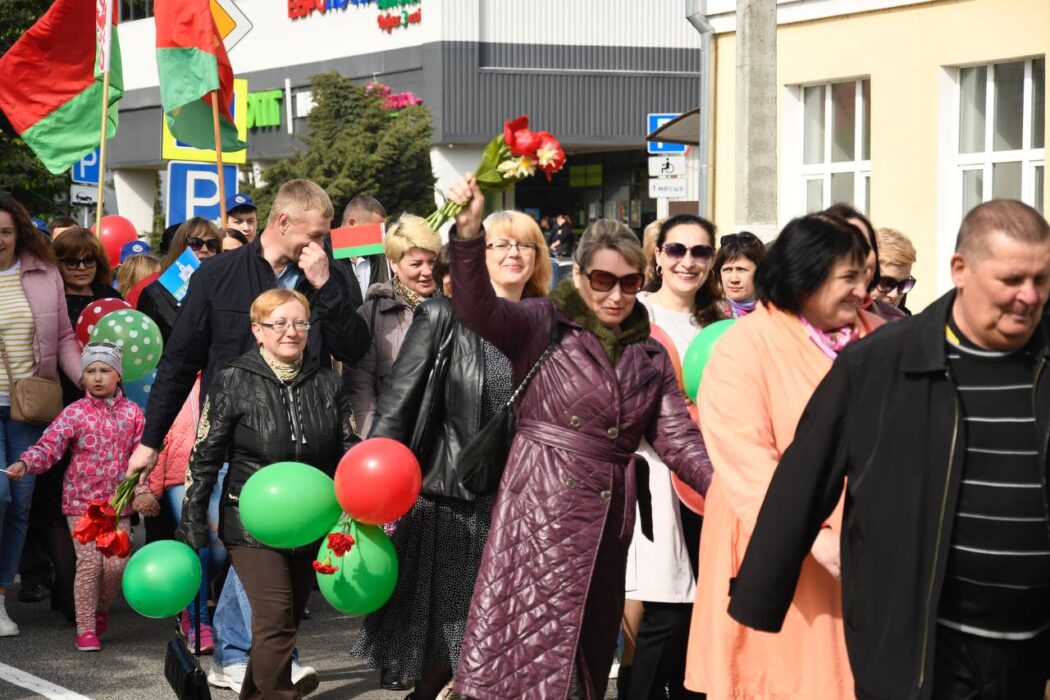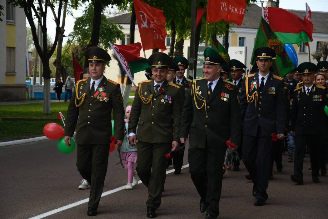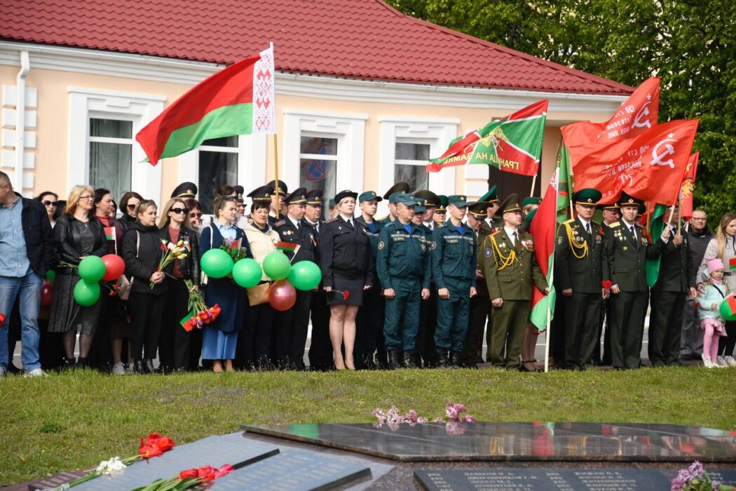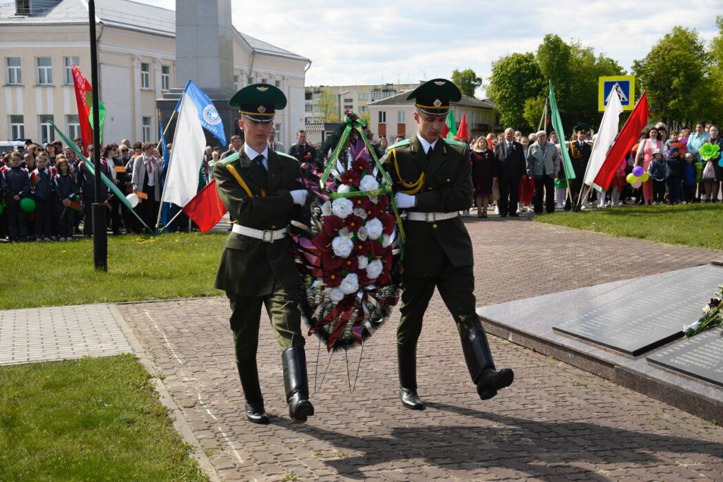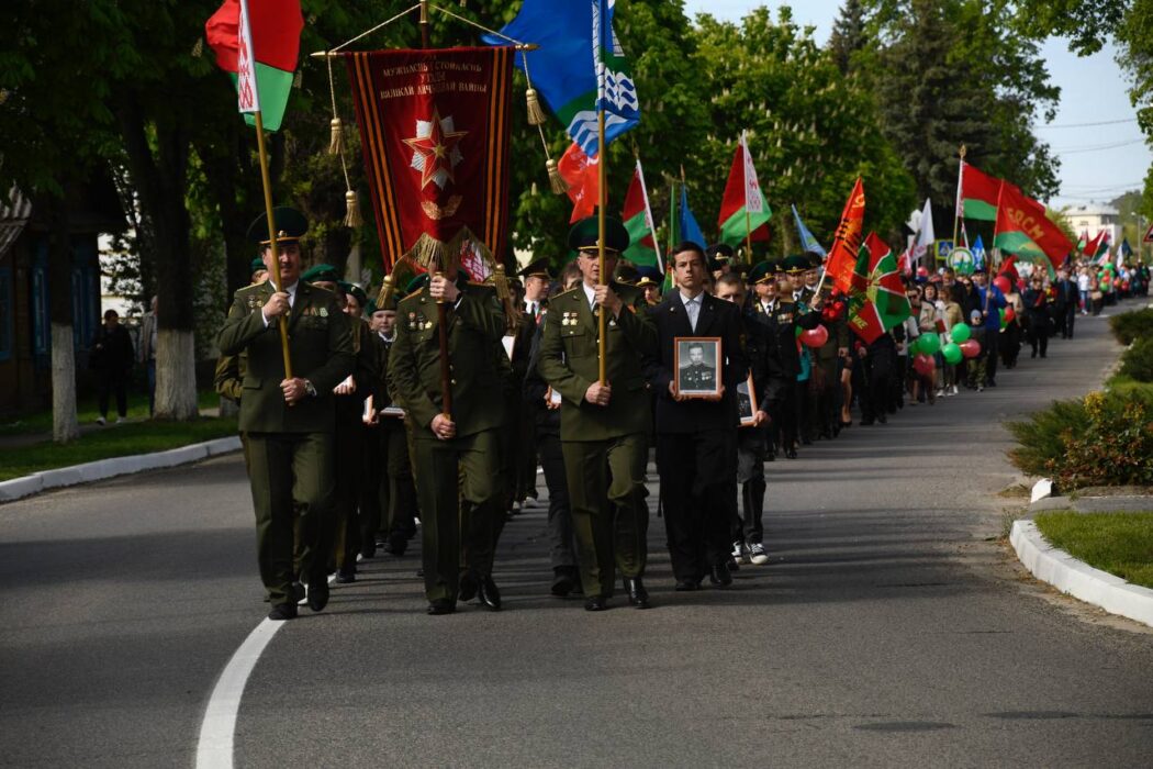 Празднование Дня Победы стартовало торжественным шествием представителей районной вертикали, общественных организаций, трудовых коллективов, молодежи. Колонна прошла от Беларусбанка к центральной площади. В ровном строю, раскрашенном государственными флагами, воздушными шарами и цветами, многие несут портреты своих родных и близких, тех, кто приближал долгожданную победу.