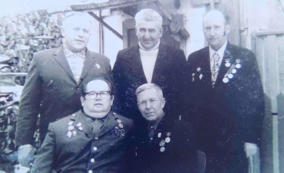 В первом ряду И. Жолобов, Г. Чирик, стоят Н. Шинкоренко, В. Денисенко, В. Томашук. Солтаново, 1973 год