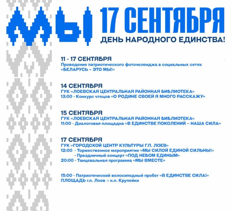 Общество 08.09.202308.09.2023 АФИША ПРАЗДНИЧНЫХ МЕРОПРИЯТИЙ КО ДНЮ НАРОДНОГО ЕДИНСТВА Опубликовал: Лоевский край