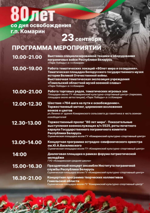 Общество 21.09.2023 ПРОГРАММА МЕРОПРИЯТИЙ К 80-ЛЕТИЮ ОСВОБОЖДЕНИЯ ГОРОДСКОГО ПОСЕЛКА КОМАРИН Опубликовал: Лоевский край