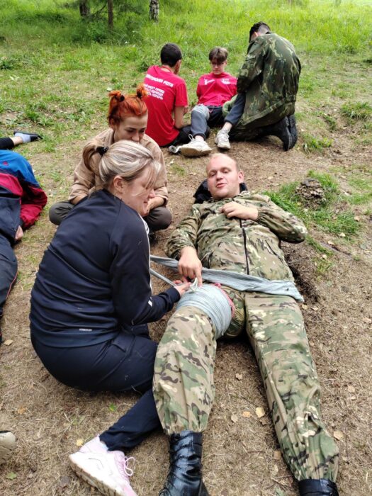 Полученные теоретические навыки лучше всего закрепляются на практике. Поэтому с ребятами проводили настоящую тактическую игру, где в имитирующей боевые условия обстановке, молодые люди учились оказывать помощь товарищам. Доставляли из красной зоны раненого человека в желтую, а затем — в зеленую и прочее.